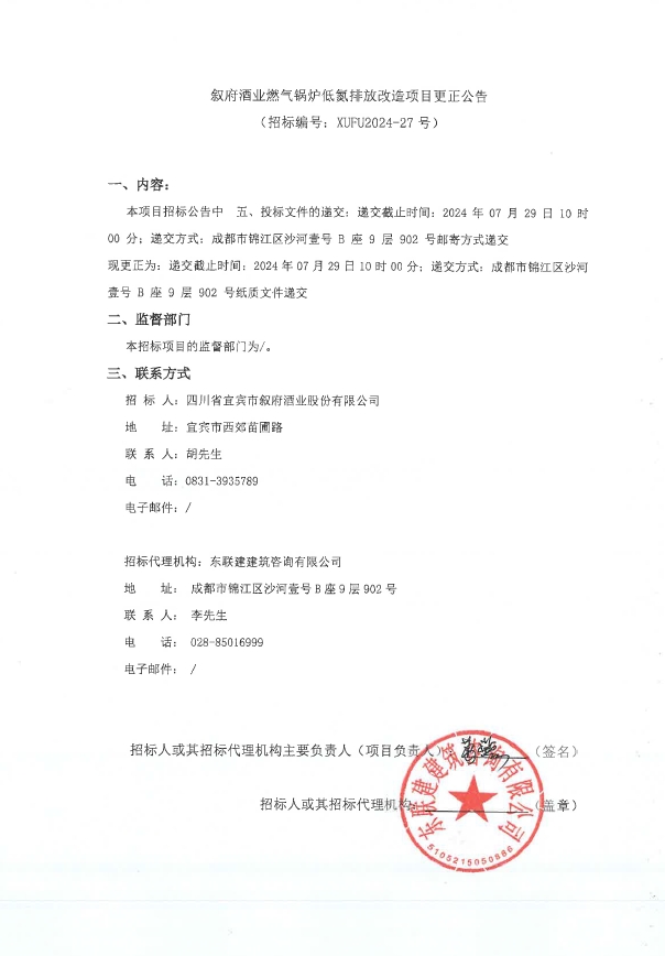 四川省宜賓市敘府酒業(yè)股份有限公司燃氣鍋爐低氮排放改造項目更正公告