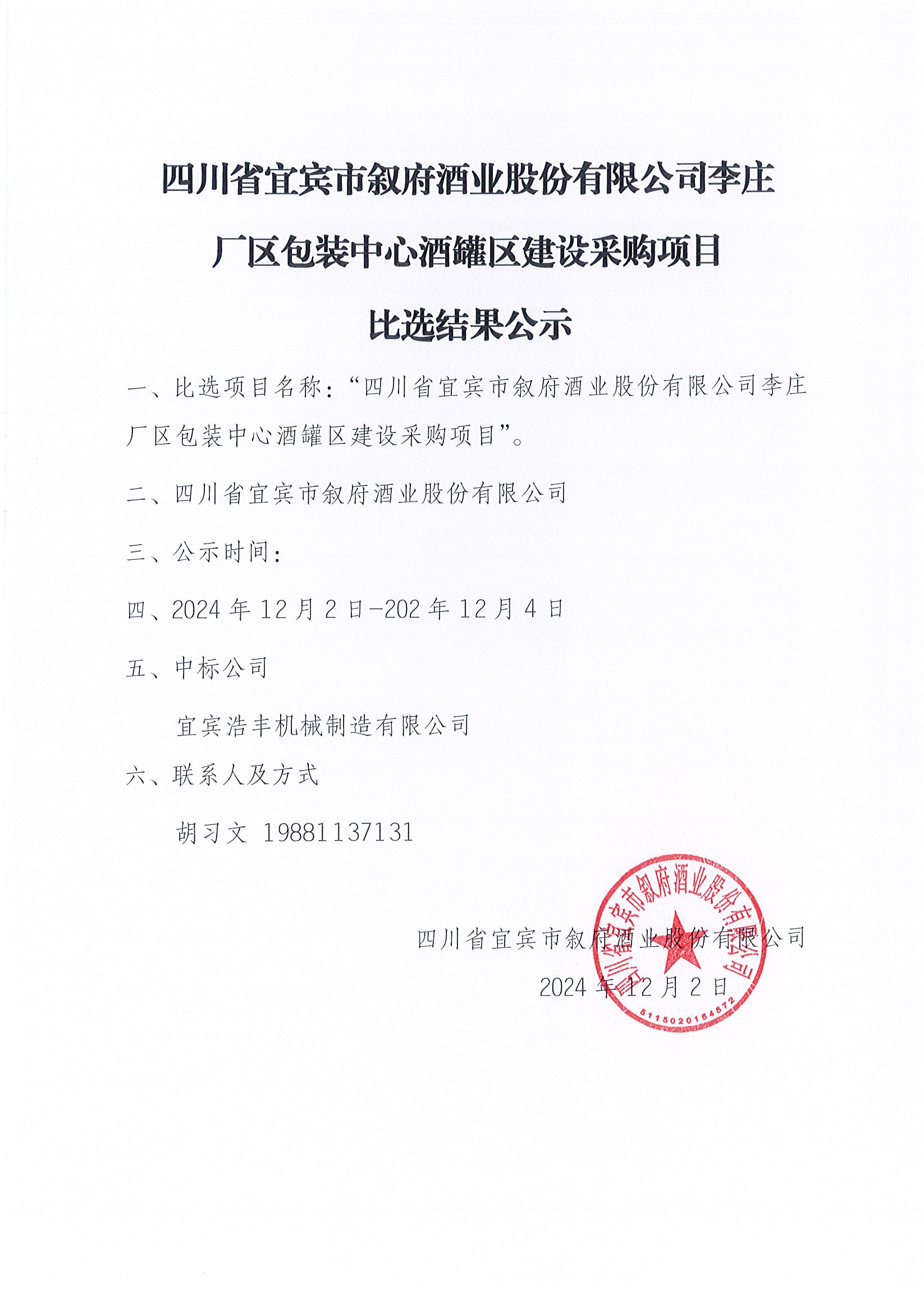 四川省宜賓市敘府酒業(yè)股份有限公司李莊廠區(qū)包裝中心酒罐區(qū)建設(shè)采購項目比選結(jié)果公示