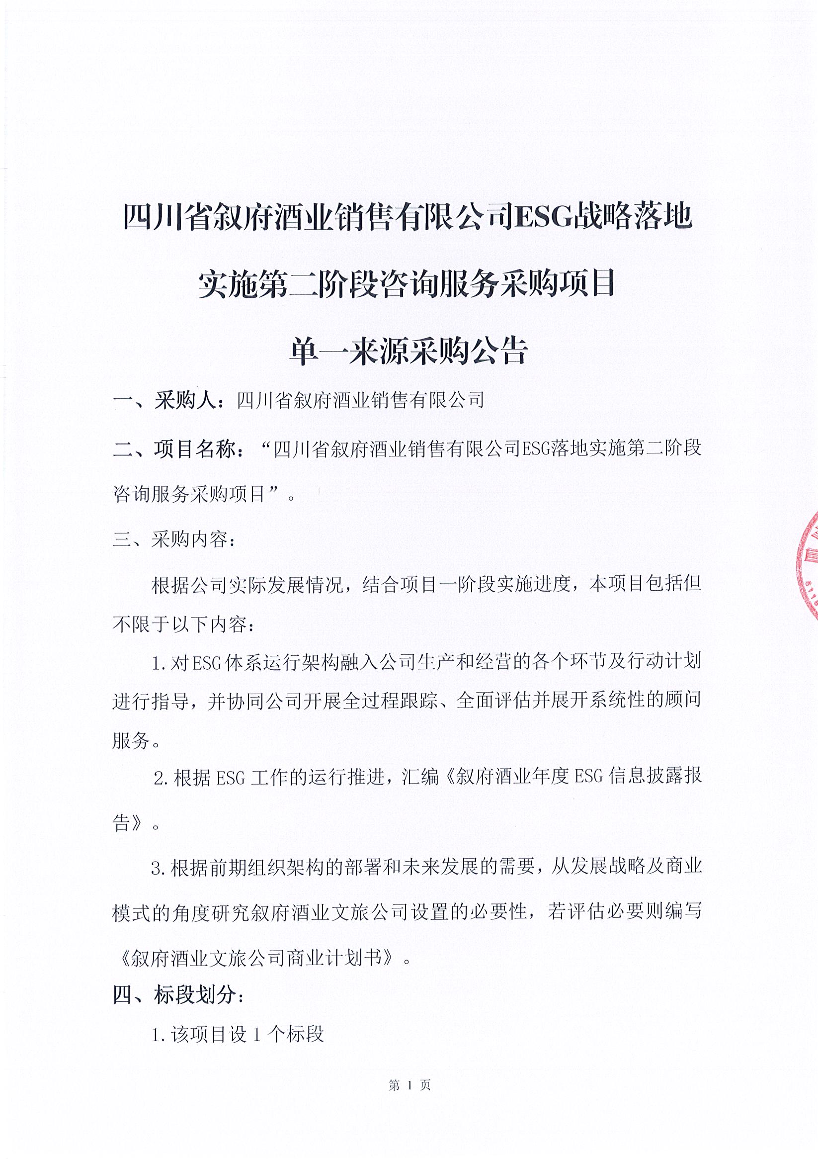 四川省敘府酒業(yè)銷售有限公司ESG落地實施第二階段咨詢服務(wù)采購項目單一來源公示公告