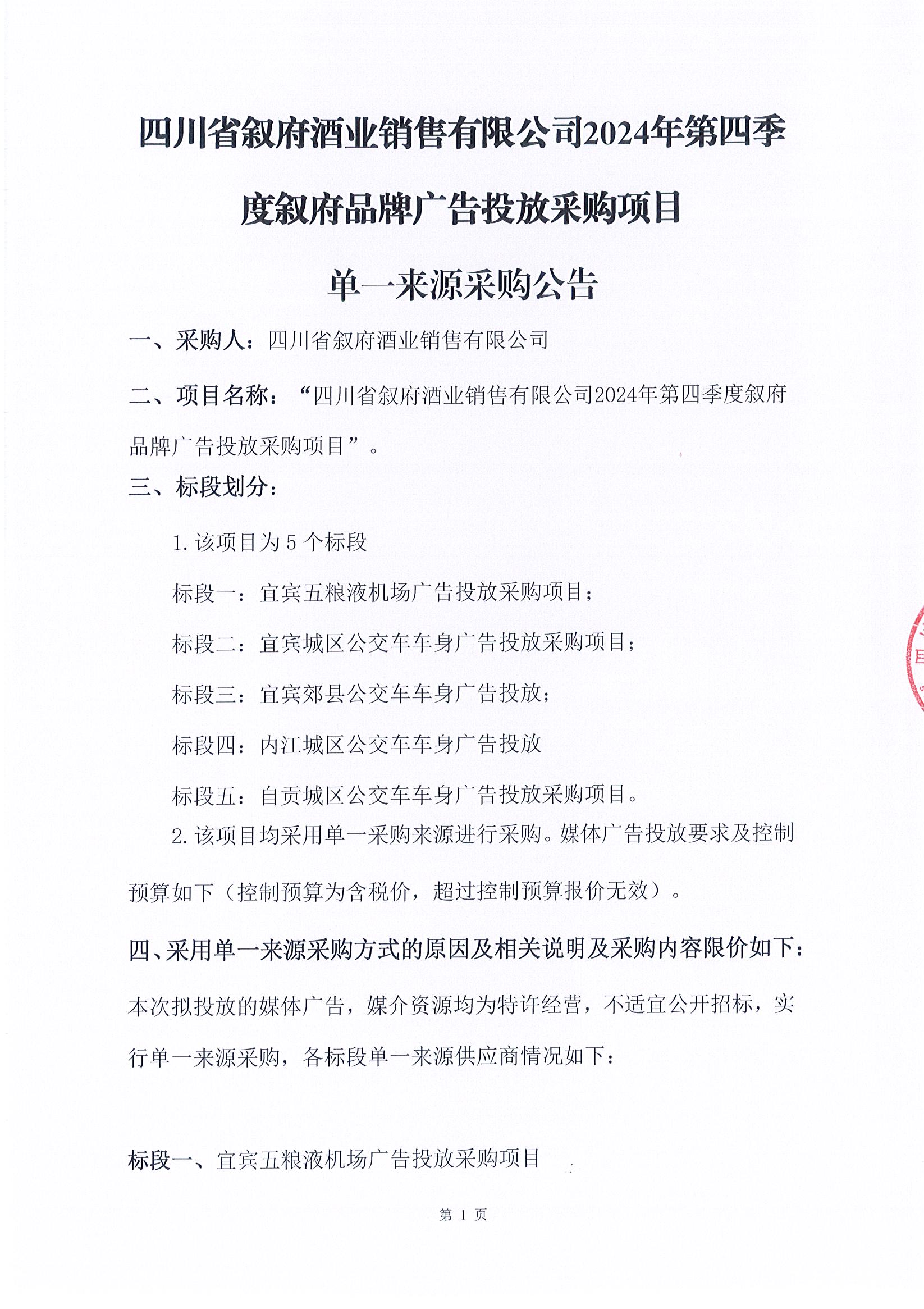 四川省敘府酒業(yè)銷售有限公司2024年第四季度敘府品牌廣告投放單一來源采購公示公告