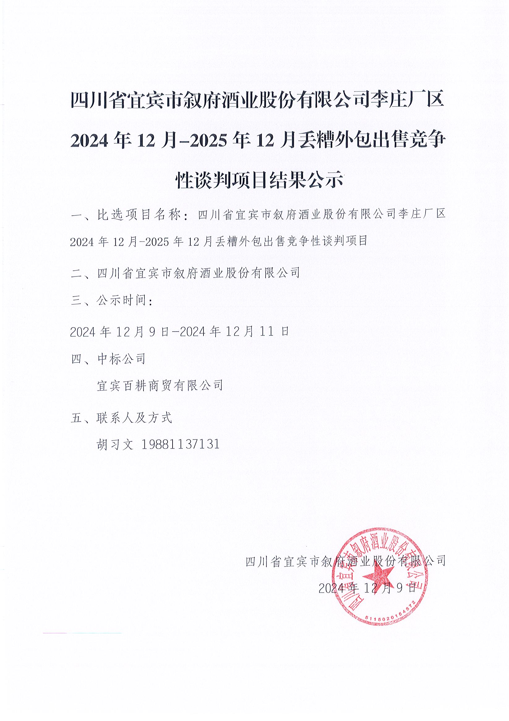 四川省宜賓市敘府酒業(yè)股份有限公司李莊廠區(qū)2024年12月-2025年12月丟糟外包出售競爭性談判項目結(jié)果公示