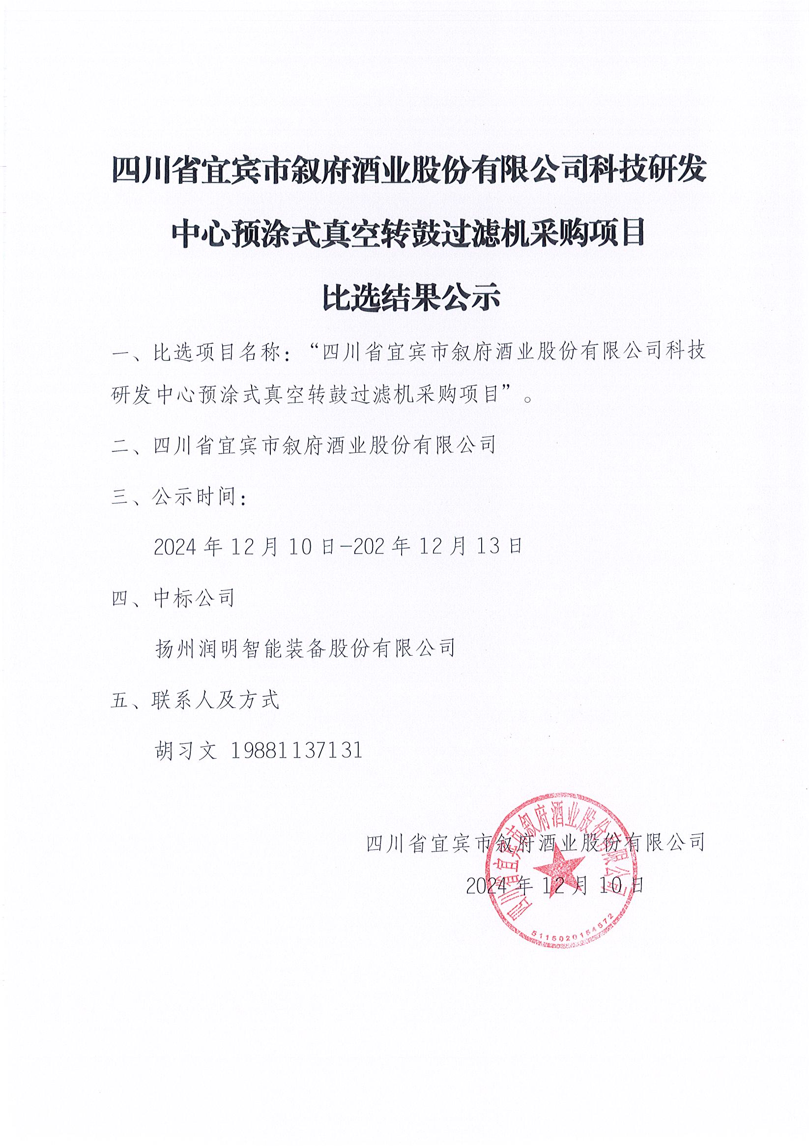 四川省宜賓市敘府酒業(yè)股份有限公司科技研發(fā)中心預(yù)涂式真空轉(zhuǎn)鼓過濾機(jī)采購項目比選公示公告