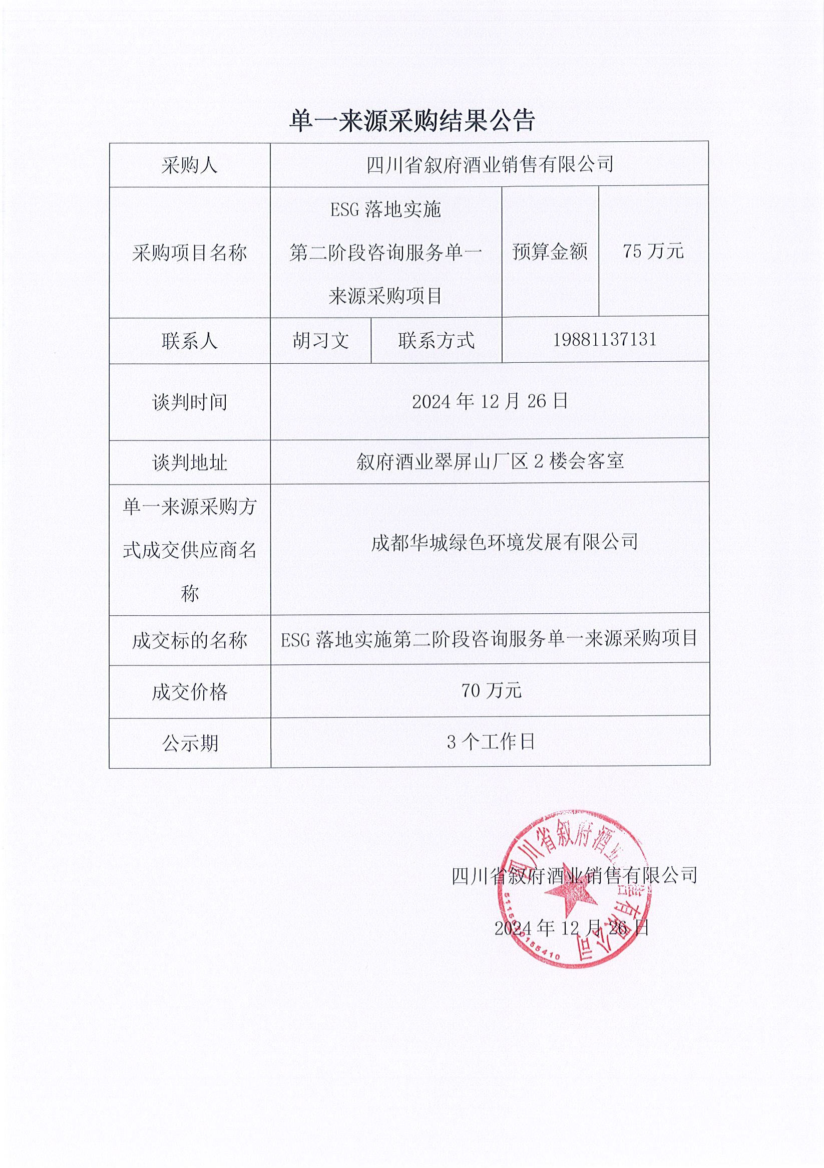 四川省敘府酒業(yè)銷售有限公司ESG落地實施 第二階段咨詢服務(wù)單一 來源采購項目結(jié)果公示公告