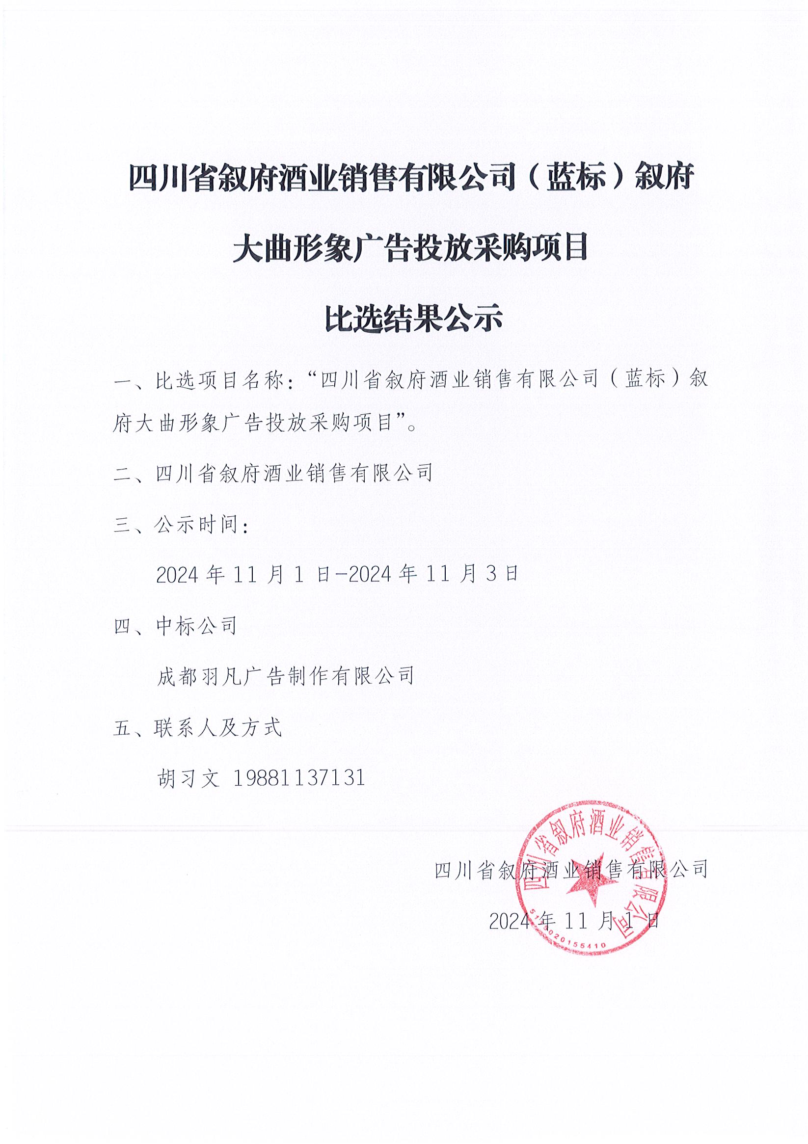 四川省敘府酒業(yè)銷售有限公司(藍(lán)標(biāo))敘府大曲形象廣告投放采購項(xiàng)目比選結(jié)果公示