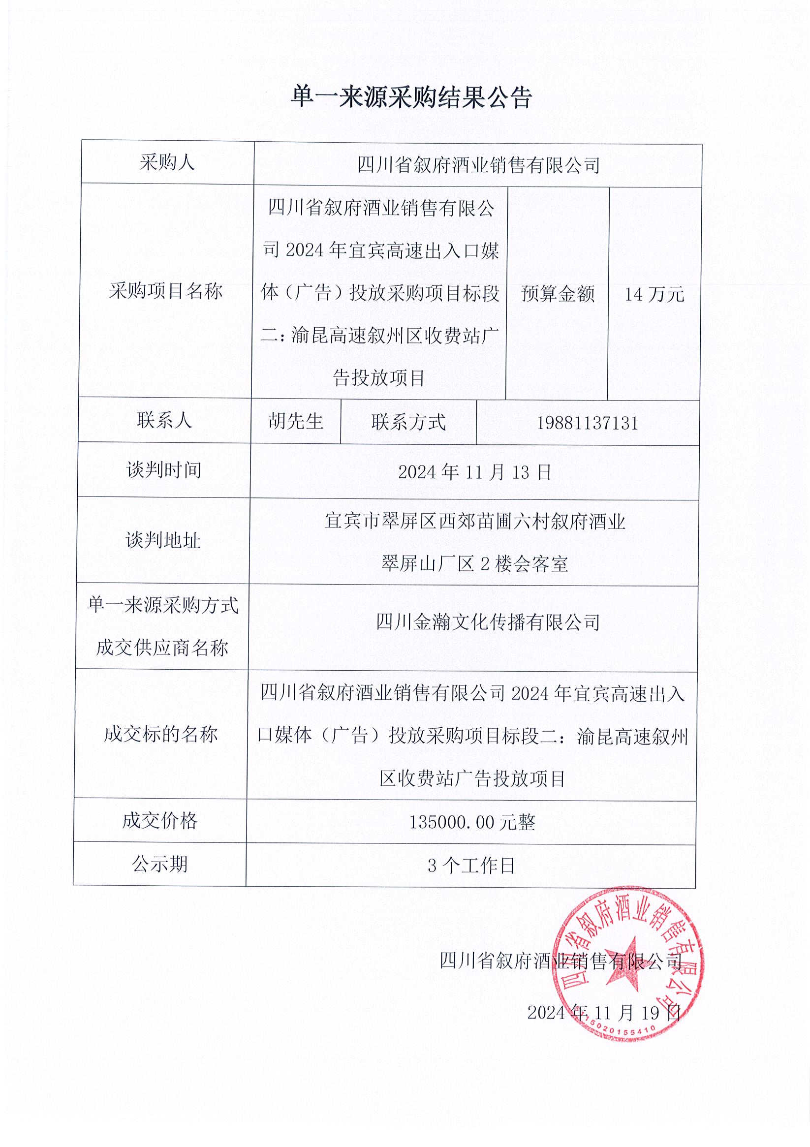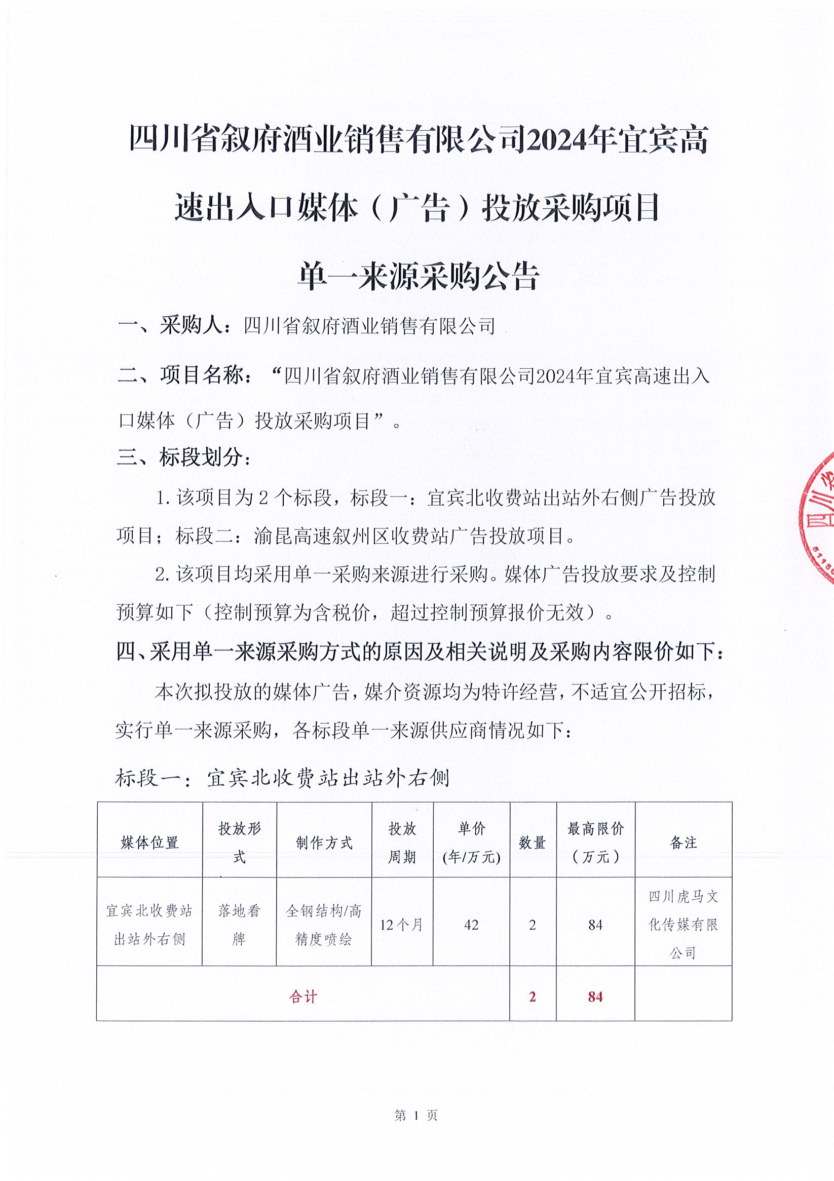 四川省敘府酒業(yè)銷售有限公司2024年宜賓高速出入口媒體(廣告)投放采購項(xiàng)目標(biāo)段一、標(biāo)段二單一來源結(jié)果公示公告