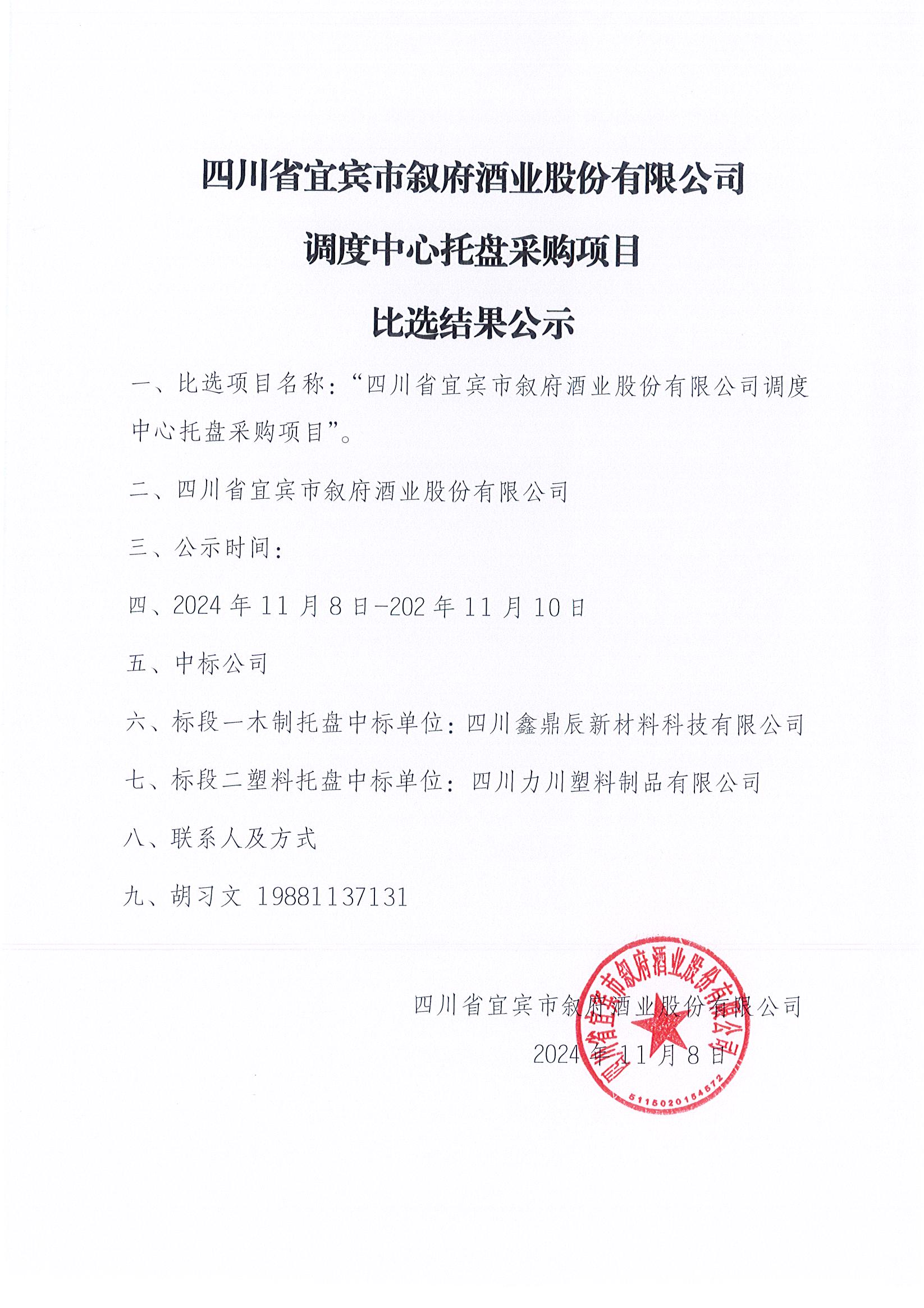 四川省宜賓市敘府酒業(yè)股份有限公司 調(diào)度中心托盤采購項(xiàng)目 比選結(jié)果公示
