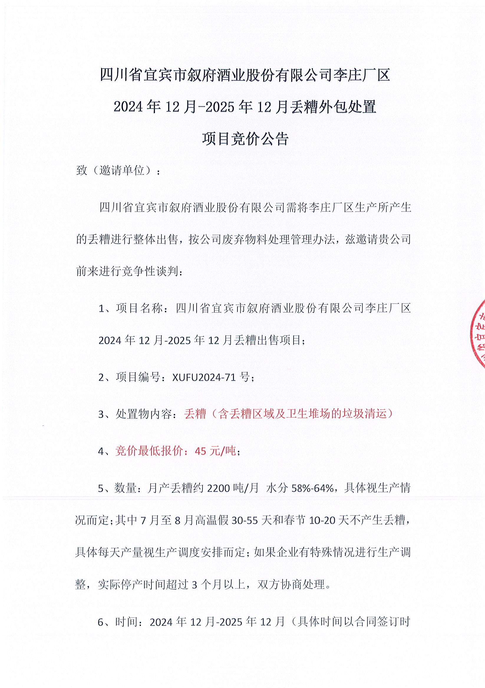 四川省宜賓市敘府酒業(yè)股份有限公司李莊廠區(qū) 2024年12月-2025年12月丟糟外包出售 競爭性談判項(xiàng)目競價(jià)公告