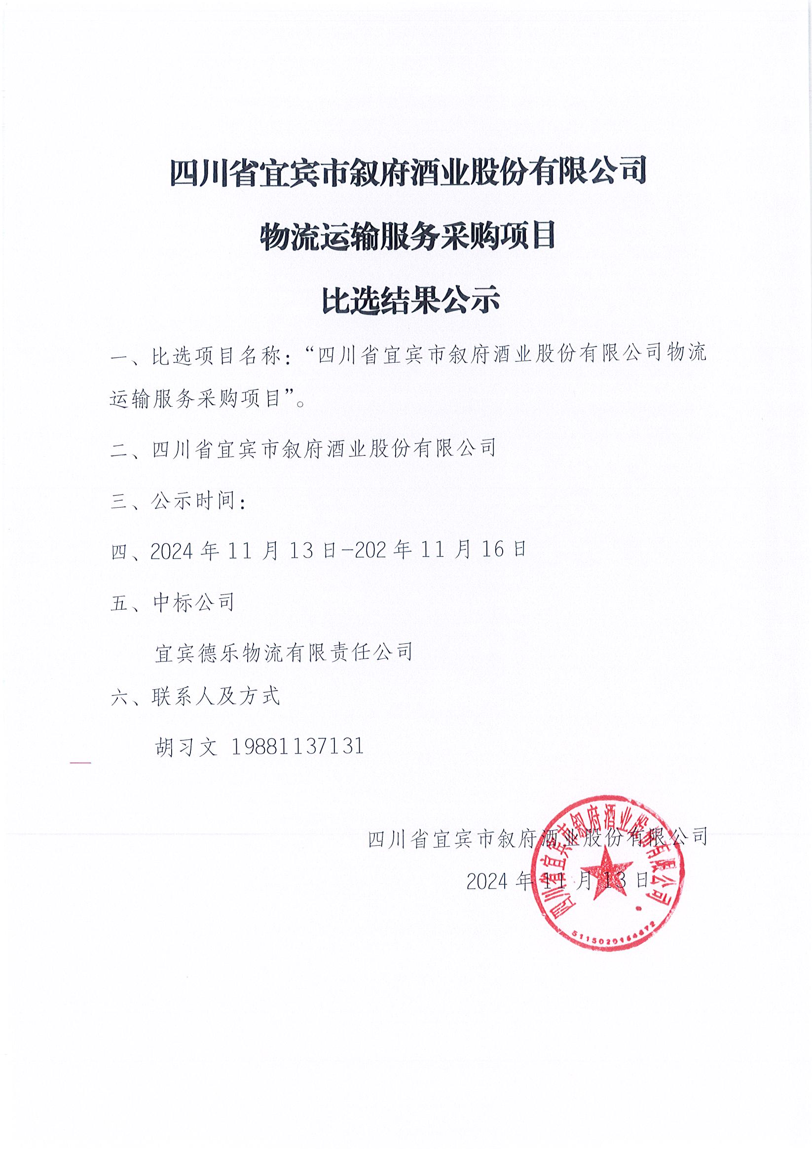 四川省宜賓市敘府酒業(yè)股份有限公司物流運(yùn)輸服務(wù)采購項(xiàng)目比選結(jié)果公示