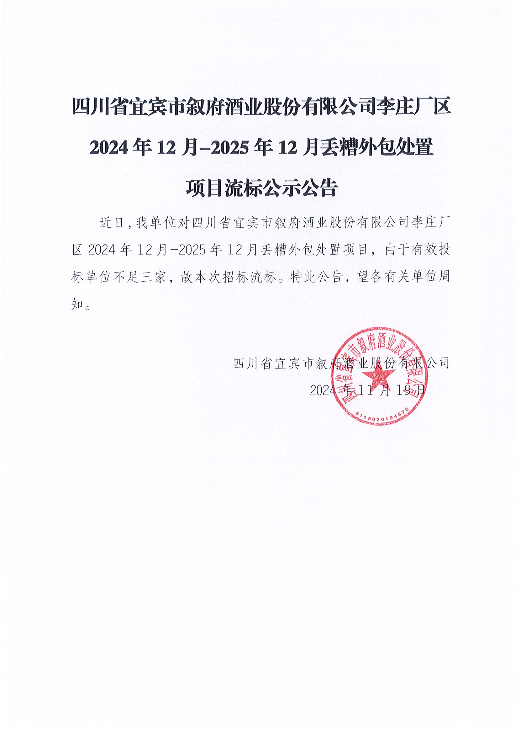 四川省宜賓市敘府酒業(yè)股份有限公司李莊廠區(qū)2024年12月-2025年12月丟糟外包處置項(xiàng)目流標(biāo)公示公告
