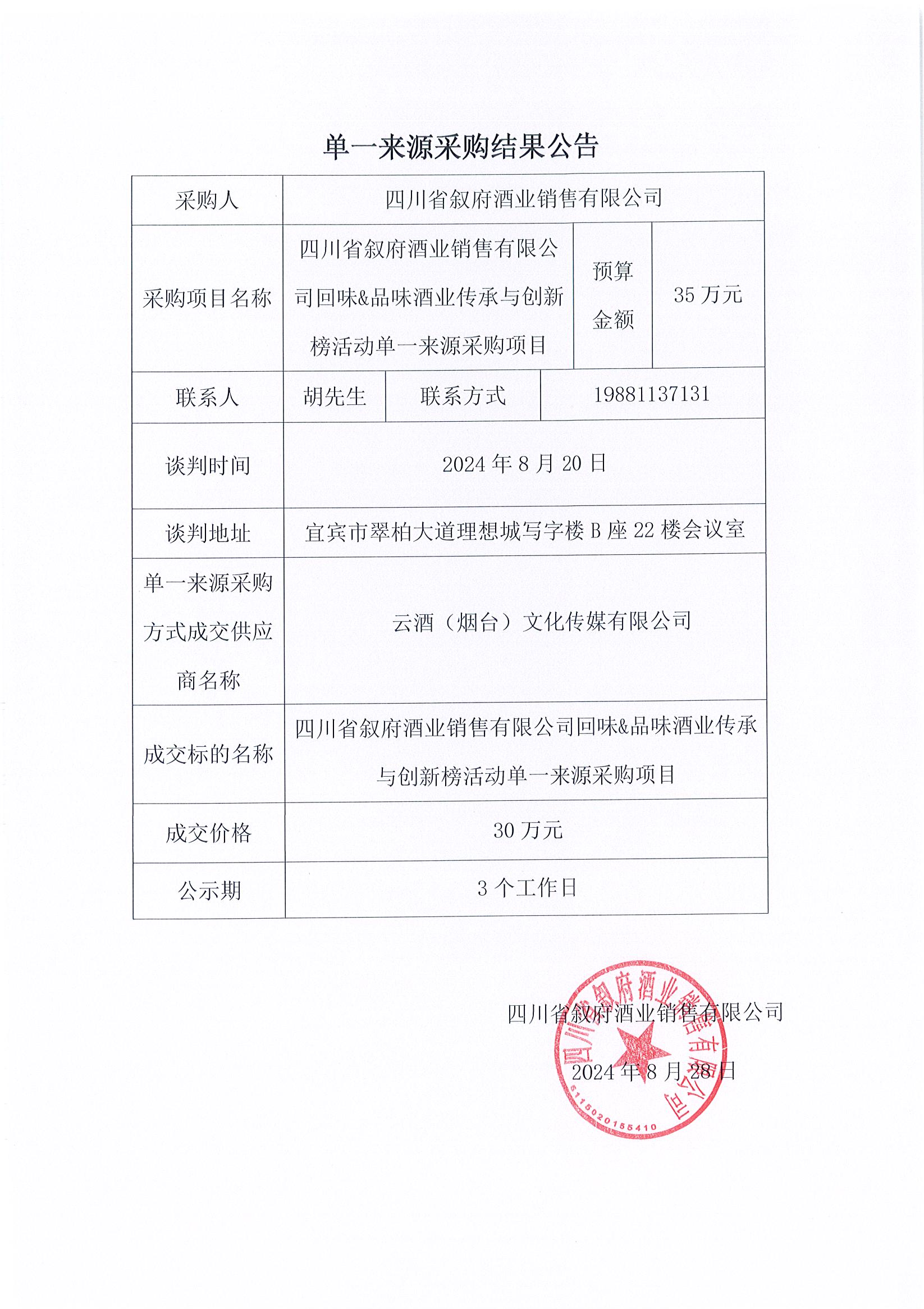 四川省敘府酒業(yè)銷售有限公司回味&品味酒業(yè)傳承與創(chuàng)新榜活動(dòng)單一來源采購項(xiàng)目中標(biāo)結(jié)果公示公告