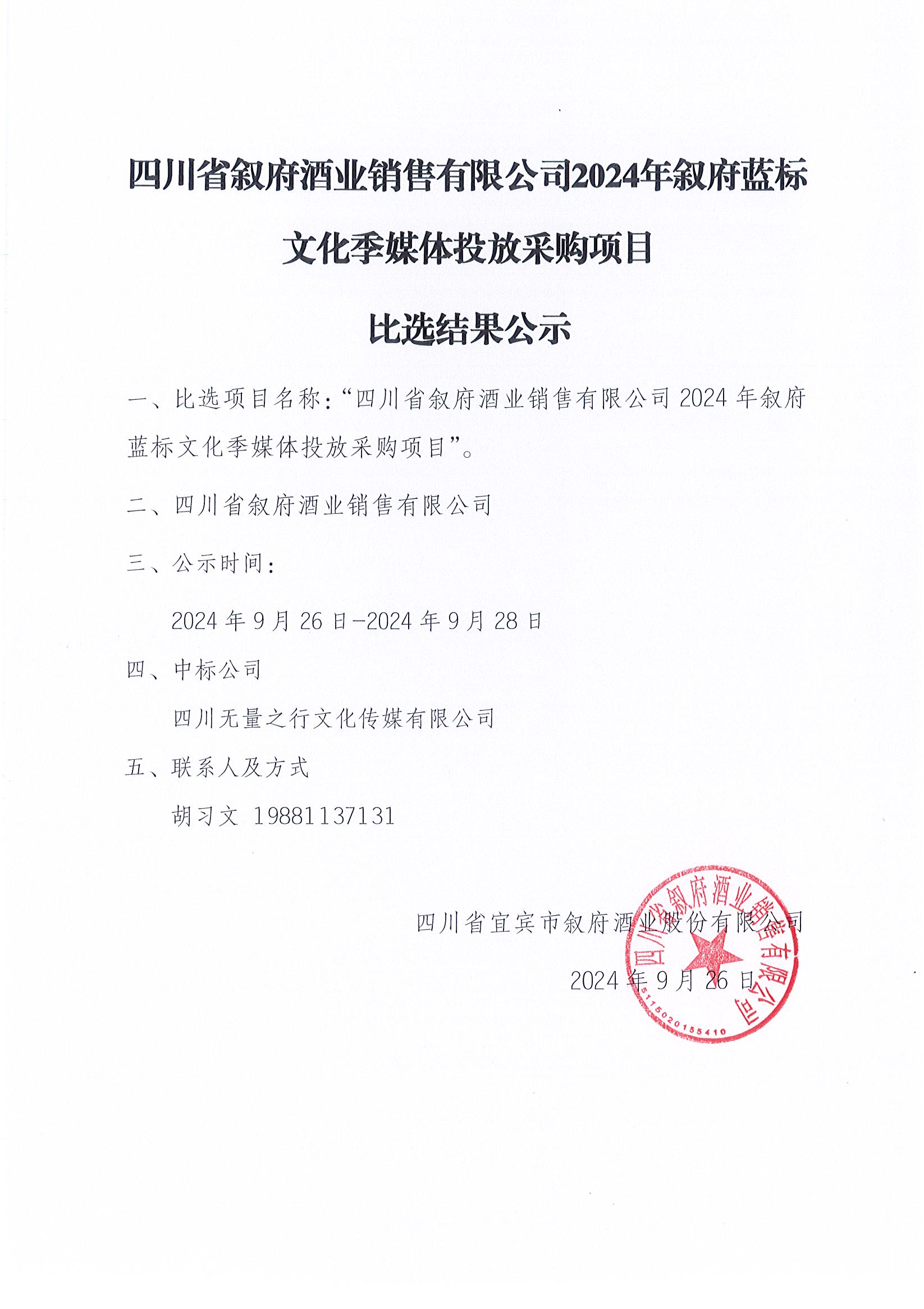四川省敘府酒業(yè)銷售有限公司2024年敘府藍(lán)標(biāo)文化季媒體投放采購項(xiàng)目比選結(jié)果公示公告
