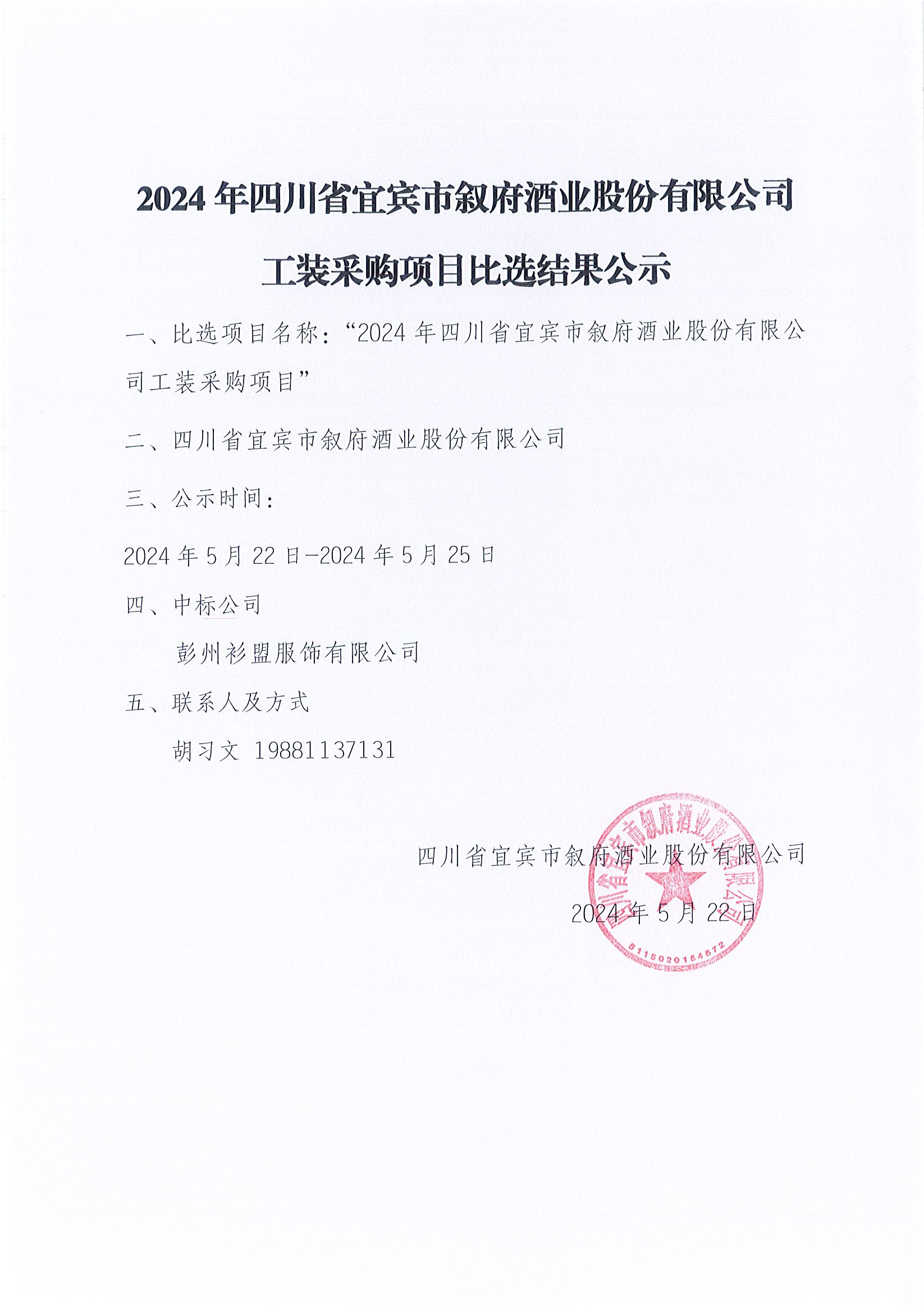 2024年四川省宜賓市敘府酒業(yè)股份有限公司工裝采購項目比選結果公示公告