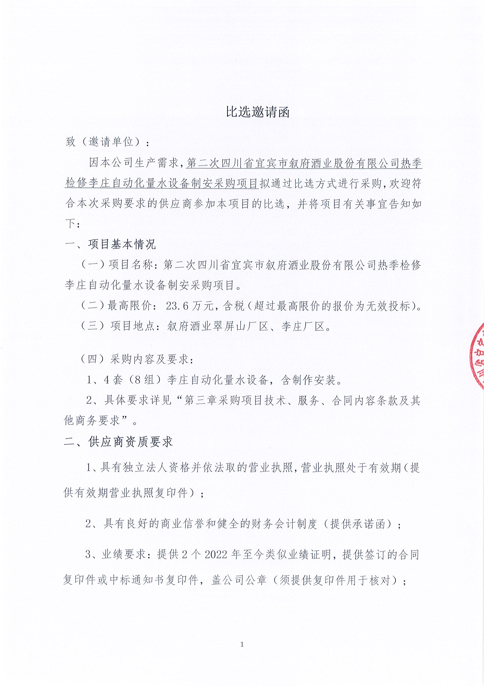 第二次四川省宜賓市敘府酒業(yè)股份有限公司熱季檢修李莊自動化量水設(shè)備制安采購項目