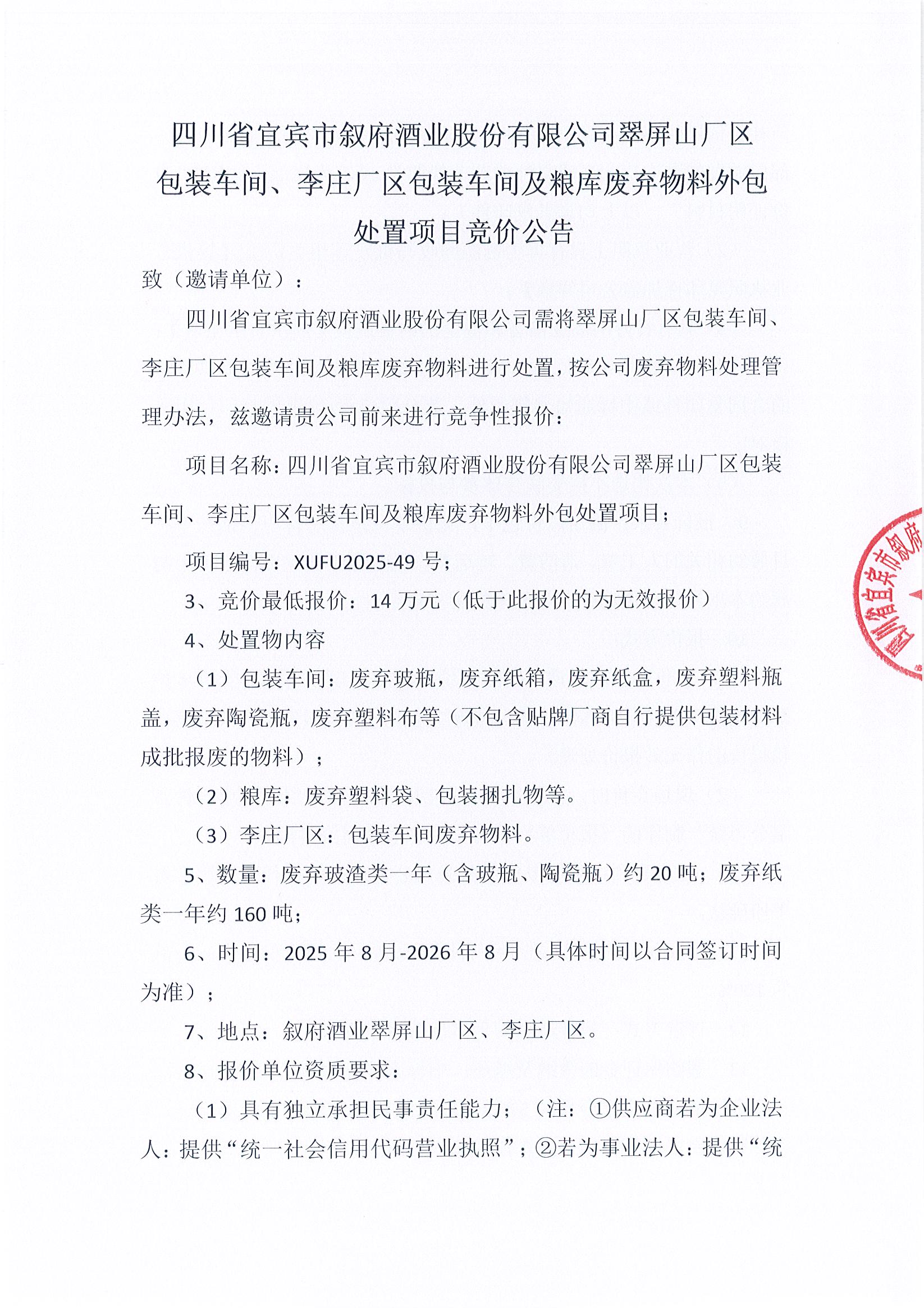 四川省宜賓市敘府酒業(yè)股份有限公司翠屏山廠區(qū)包裝車間、李莊廠區(qū)包裝車間及糧庫廢棄物料外包處置項目