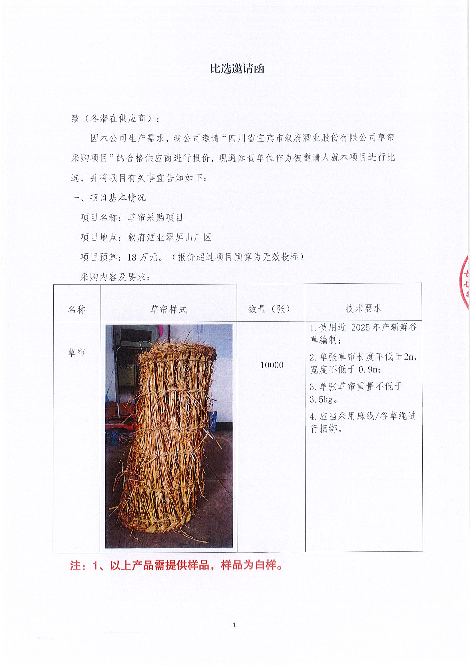 四川省宜賓市敘府酒業(yè)股份有限公司草簾采購項目比選公示公告