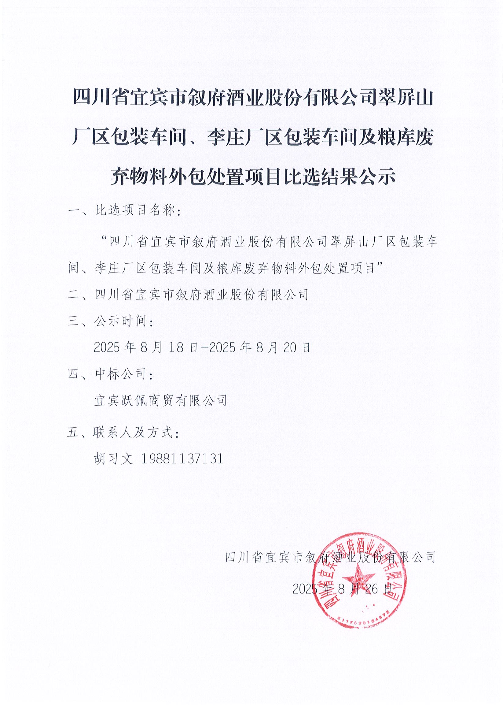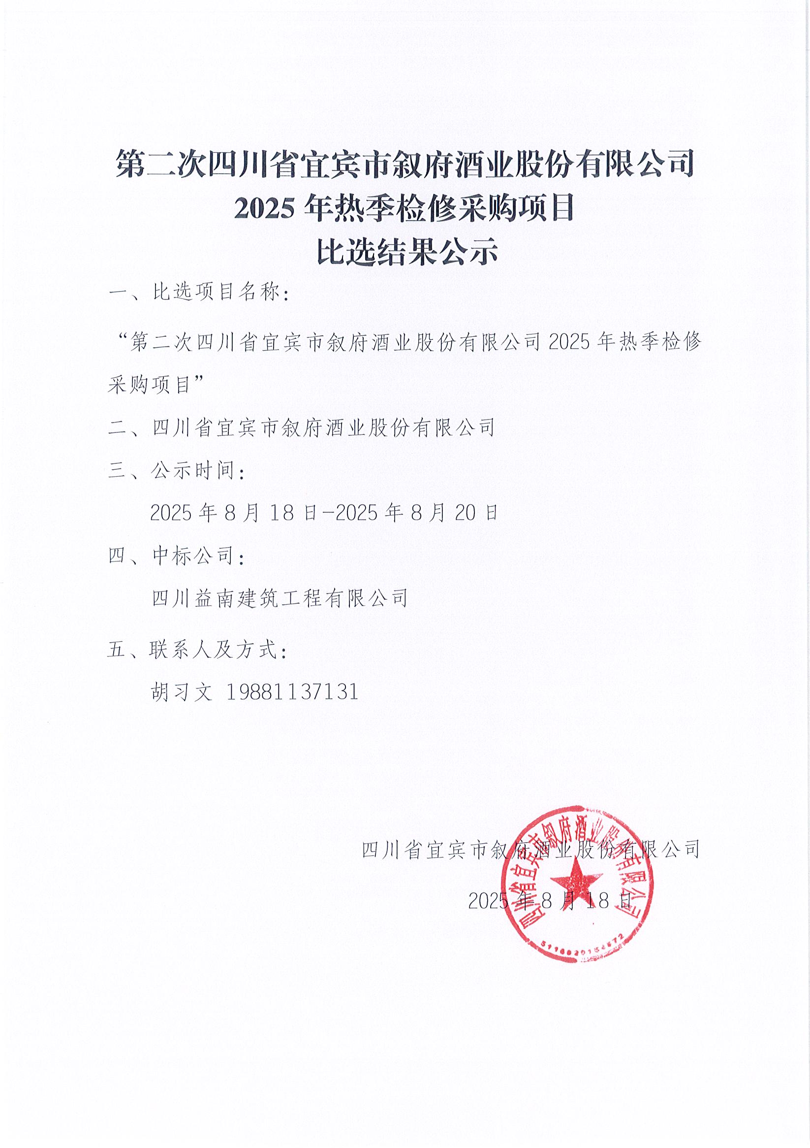 第二次四川省宜賓市敘府酒業(yè)股份有限公司2025年熱季檢修采購項目比選結(jié)果公示