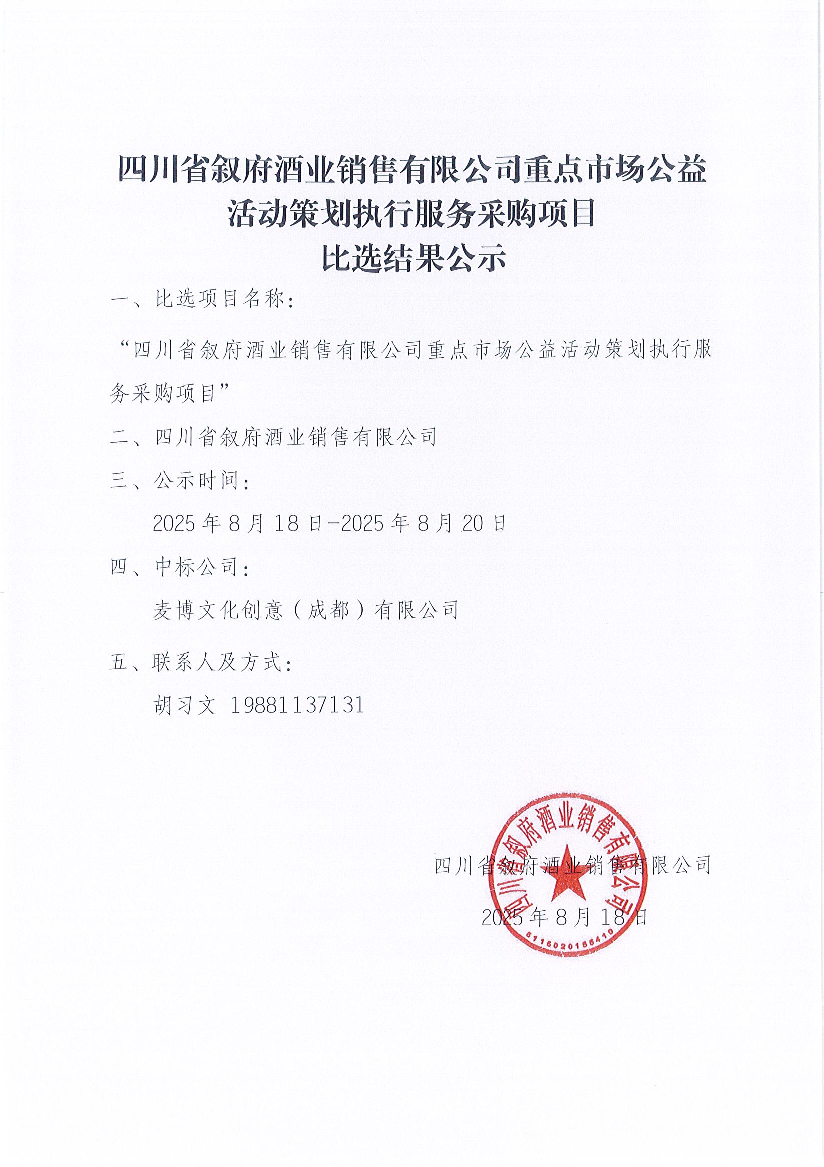四川省敘府酒業(yè)銷售有限公司重點市場公益活動策劃執(zhí)行服務采購項目比選結(jié)果公示公告