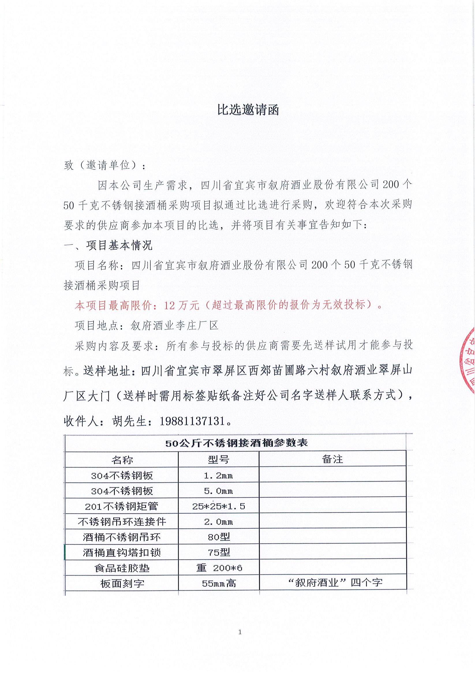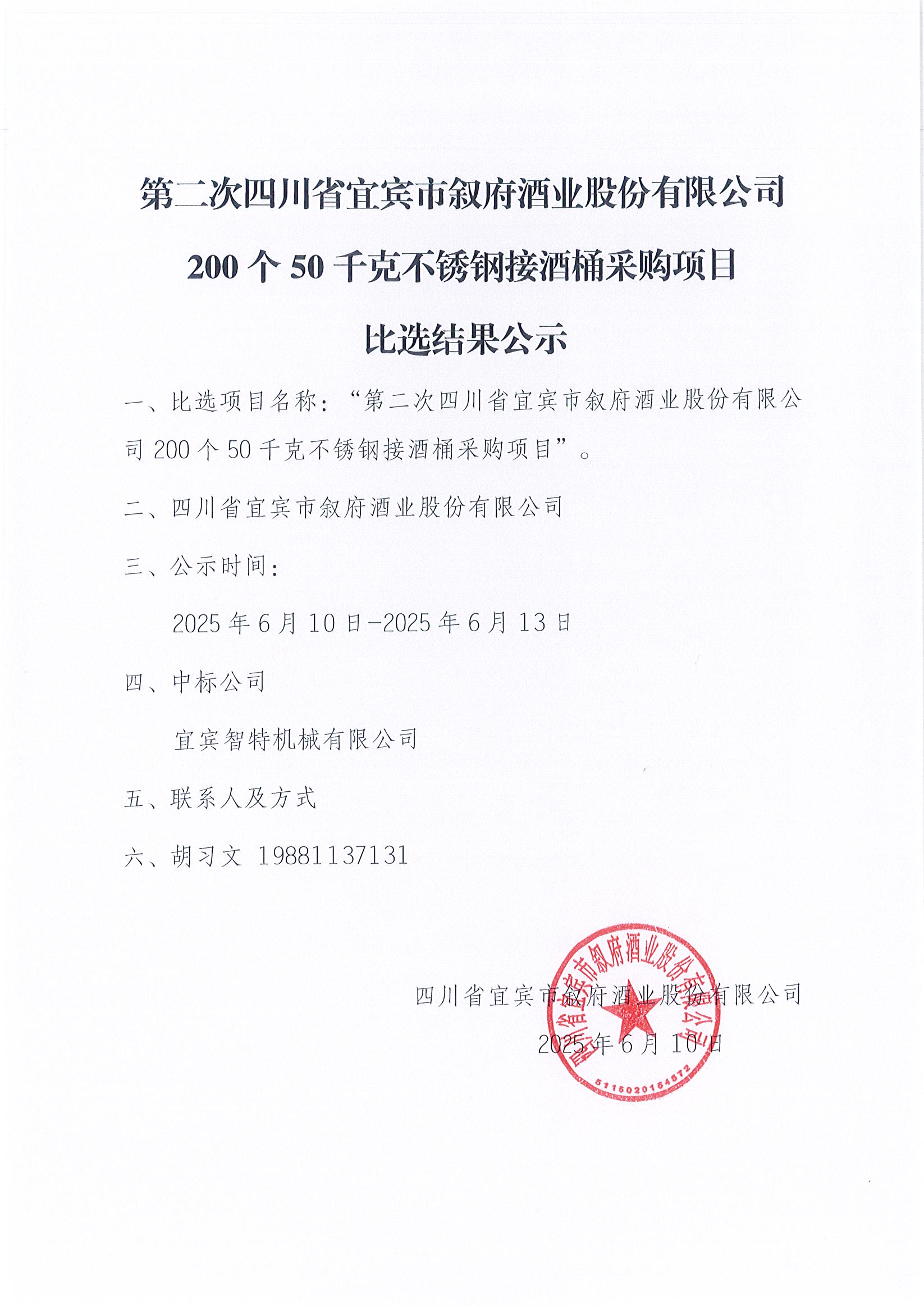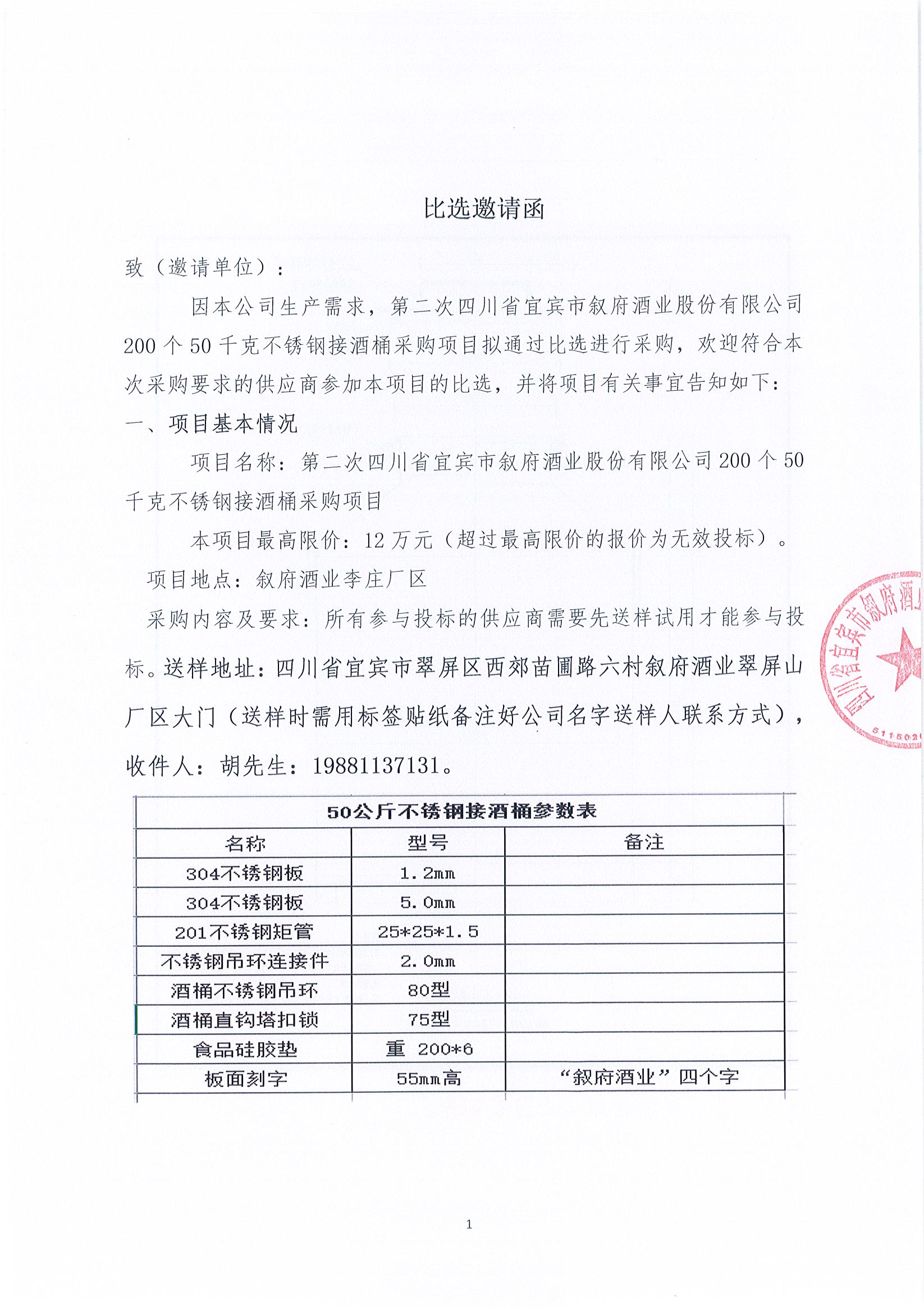 第二次四川省宜賓市敘府酒業(yè)股份有限公司200個(gè)50千克不銹鋼接酒桶采購(gòu)項(xiàng)目比選公示公告