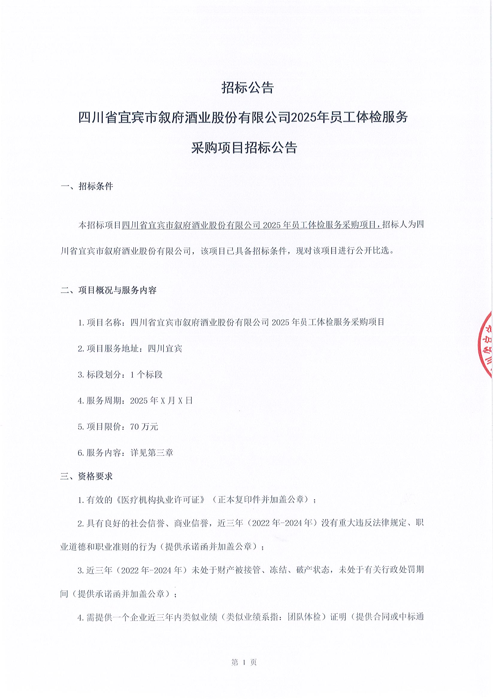 四川省宜賓市敘府酒業(yè)股份有限公司2025年員工體檢服務(wù)采購(gòu)項(xiàng)目公開(kāi)招標(biāo)公示公告