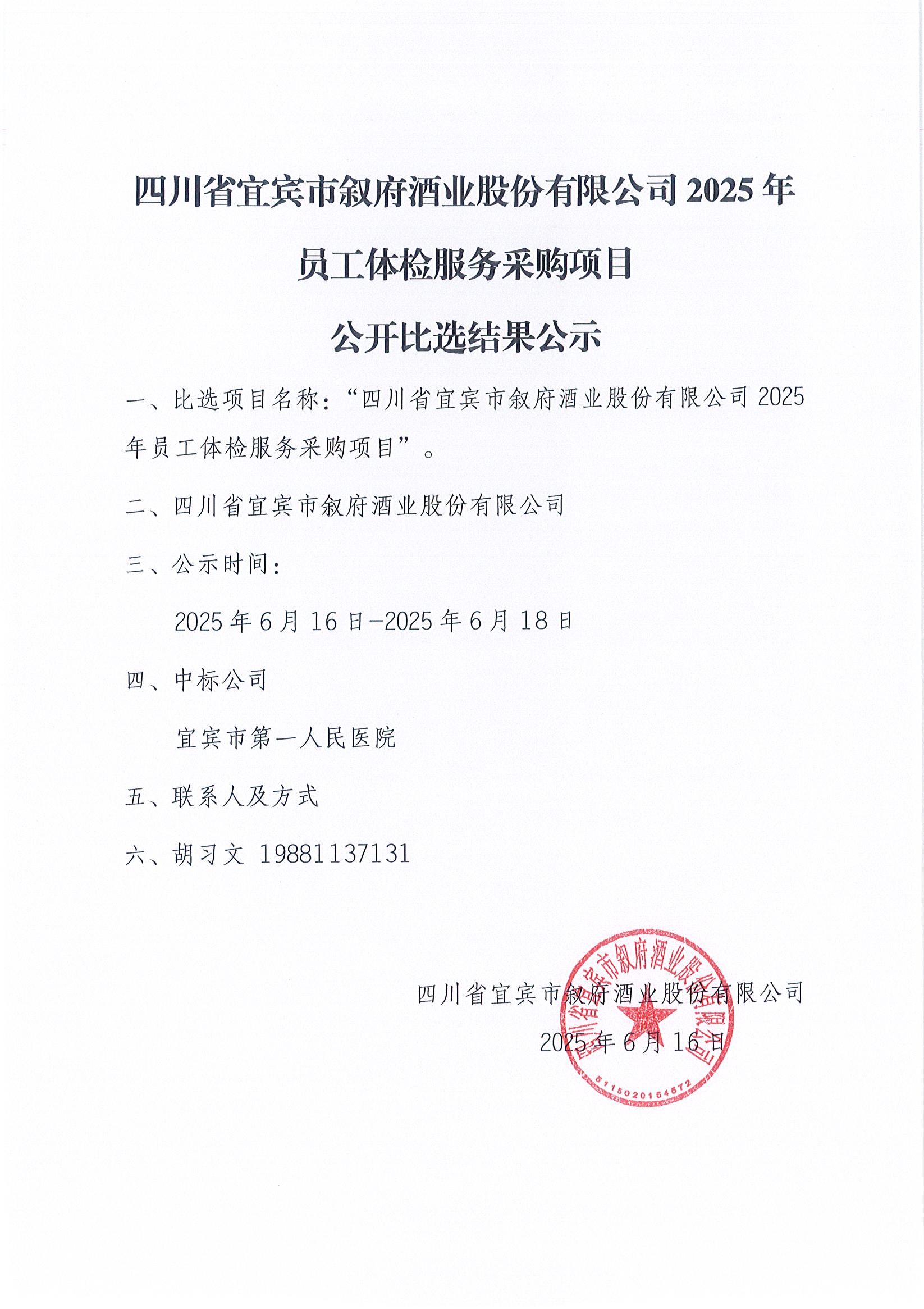 四川省宜賓市敘府酒業(yè)股份有限公司2025年員工體檢服務(wù)采購(gòu)項(xiàng)目公開(kāi)比選結(jié)果公示