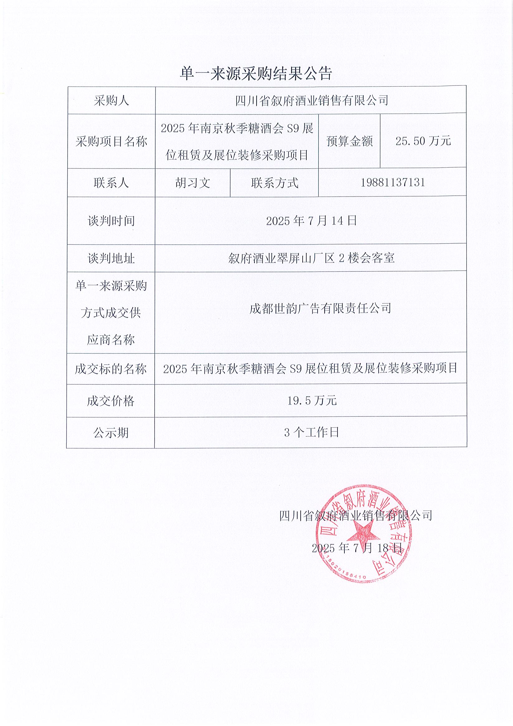 四川省宜賓市敘府酒業(yè)股份有限公司李莊陶壇安裝配套輸酒管道及噴淋系統(tǒng)采購(gòu)項(xiàng)目比選結(jié)果公告
