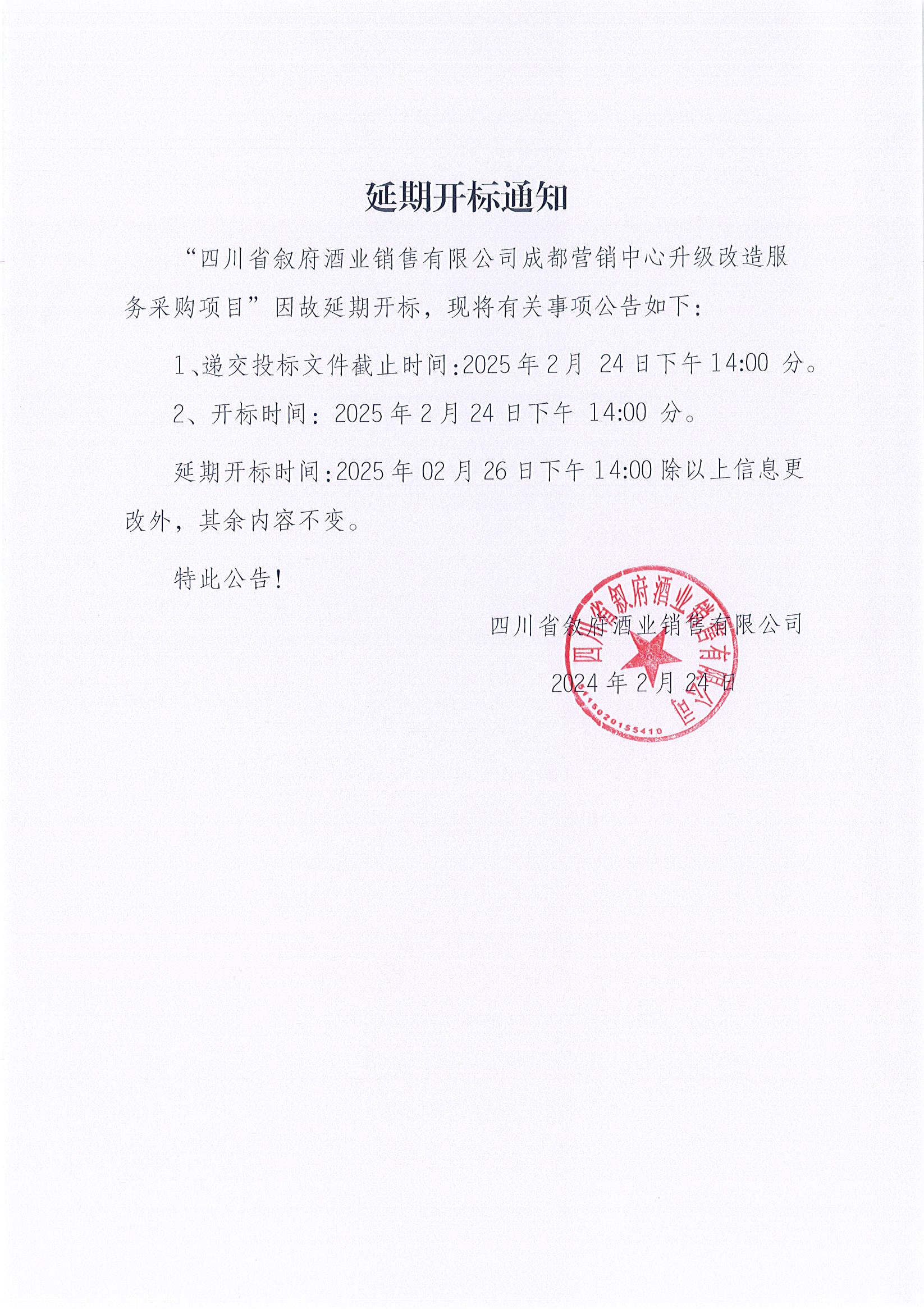 四川省敘府酒業(yè)銷售有限公司成都營(yíng)銷中心升級(jí)改造服務(wù)采購(gòu)項(xiàng)目延期開(kāi)標(biāo)通知
