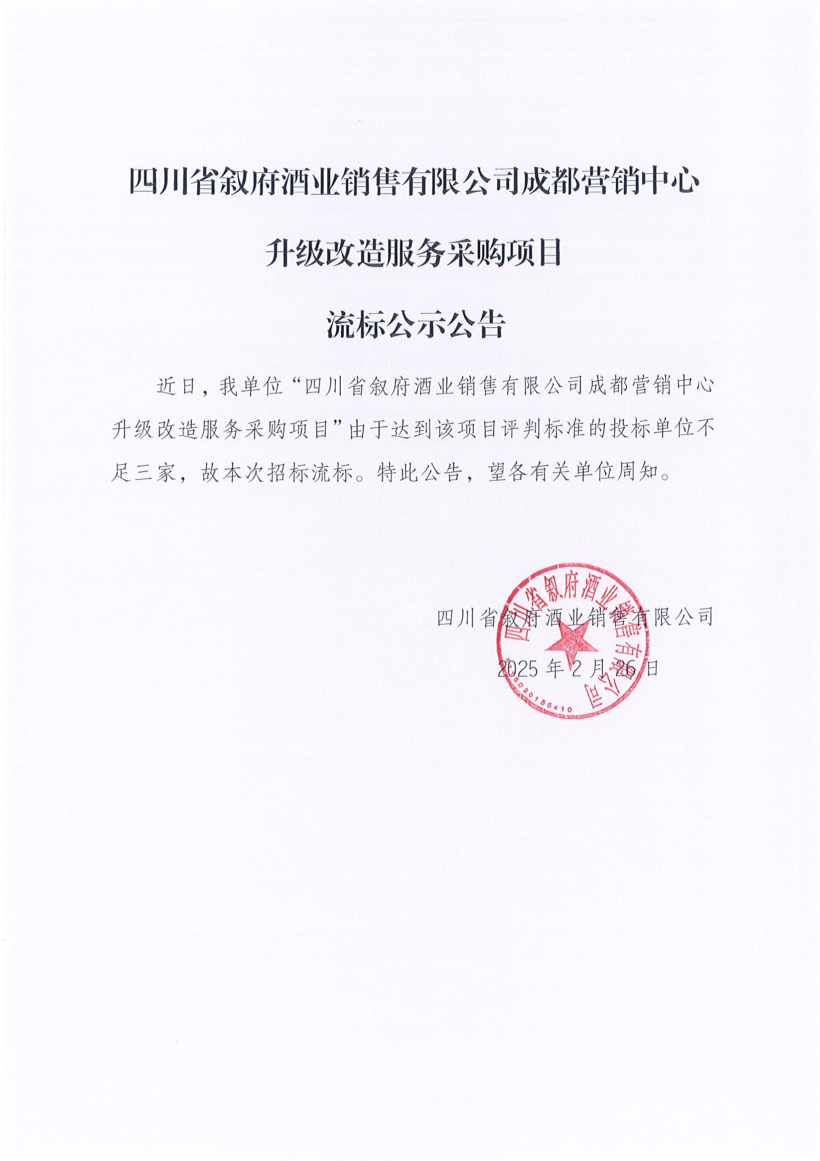 四川省敘府酒業(yè)銷售有限公司成都營(yíng)銷中心升級(jí)改造服務(wù)采購(gòu)項(xiàng)目流標(biāo)公示公告