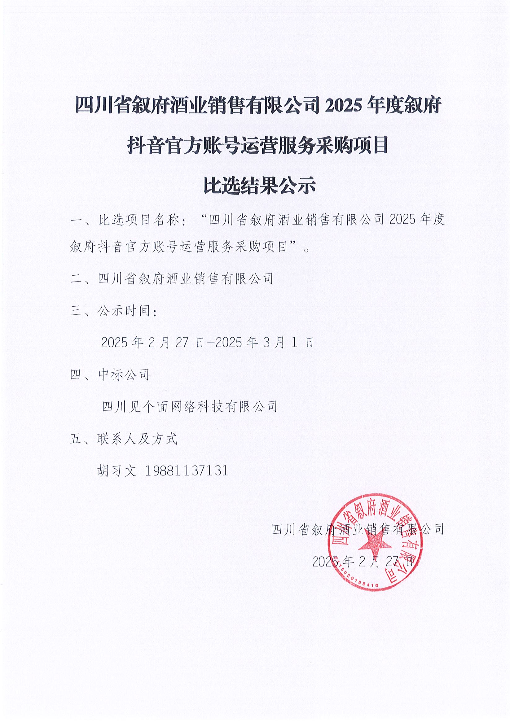 四川省敘府酒業(yè)銷售有限公司2025年度敘府抖音官方賬號(hào)運(yùn)營(yíng)服務(wù)采購(gòu)項(xiàng)目公開(kāi)比選結(jié)果公示公告