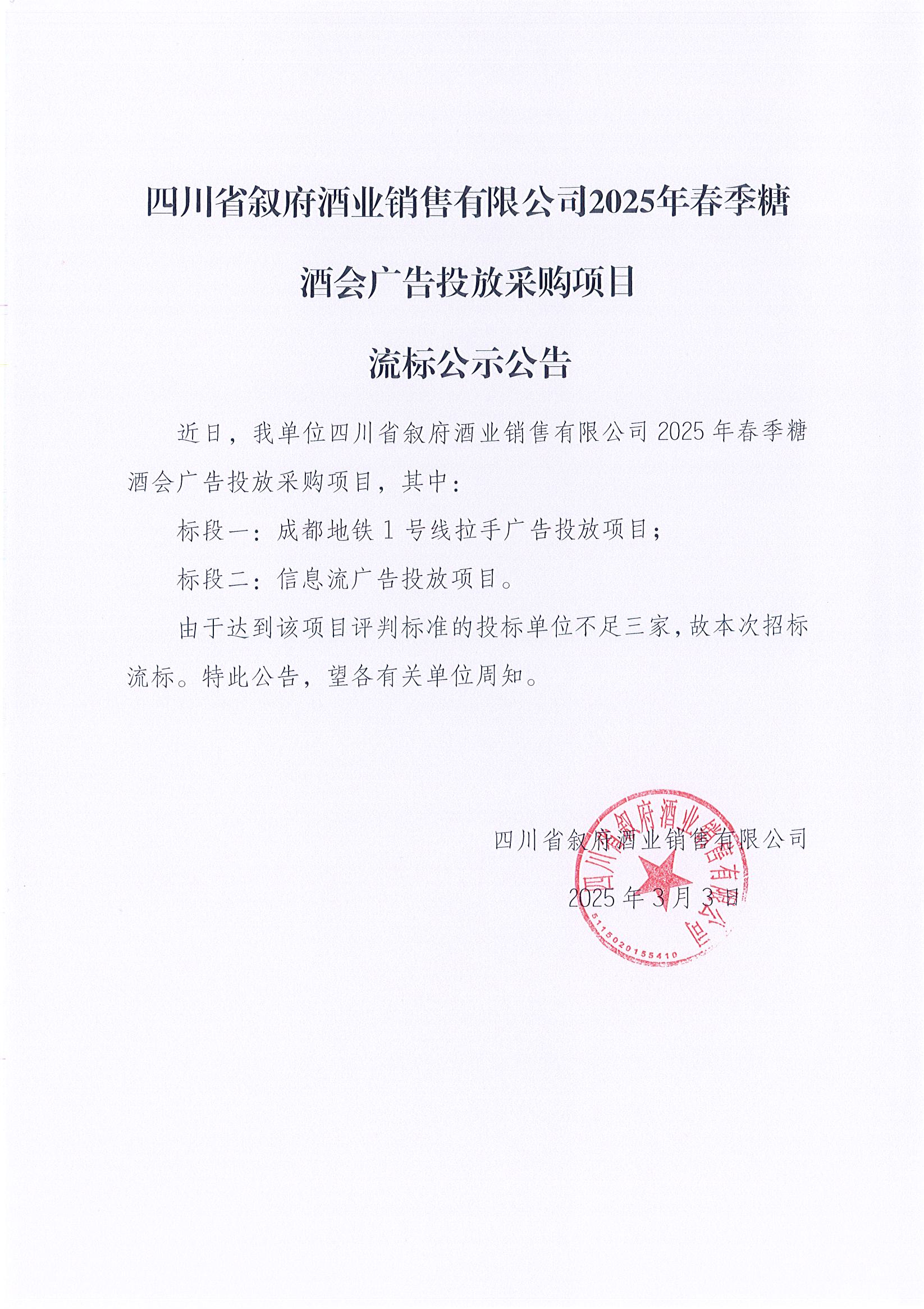 四川省敘府酒業(yè)銷售有限公司2025年春季糖酒會(huì)廣告投放采購(gòu)項(xiàng)目流標(biāo)公示公告