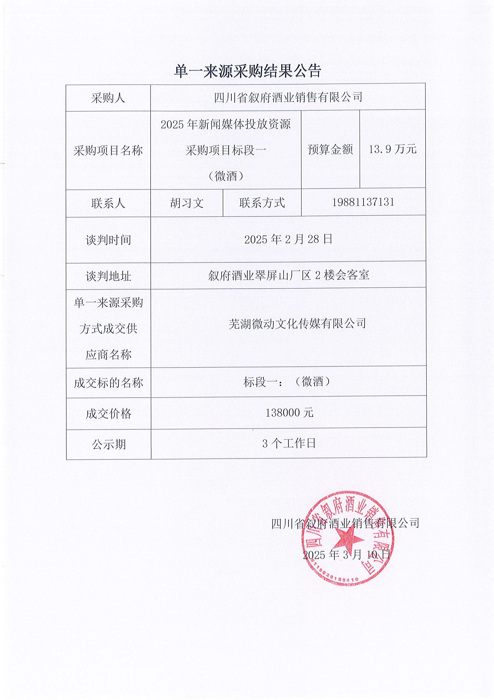 四川省敘府酒業(yè)銷售有限公司2025年度 新聞媒體投放資源采購(gòu)項(xiàng)目單一來(lái)源各標(biāo)段中標(biāo)結(jié)果公示公告