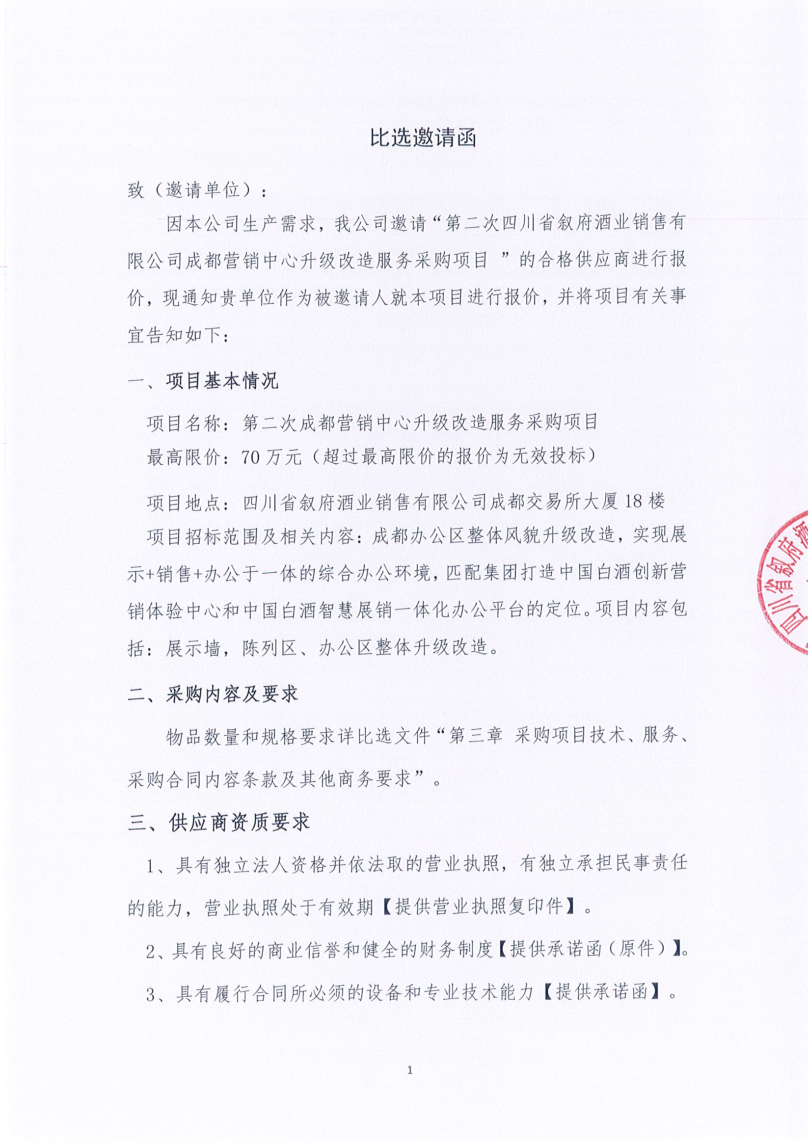 第二次四川省敘府酒業(yè)銷售有限公司成都營(yíng)銷中心升級(jí)改造服務(wù)采購(gòu)項(xiàng)目公開(kāi)比選招標(biāo)公告