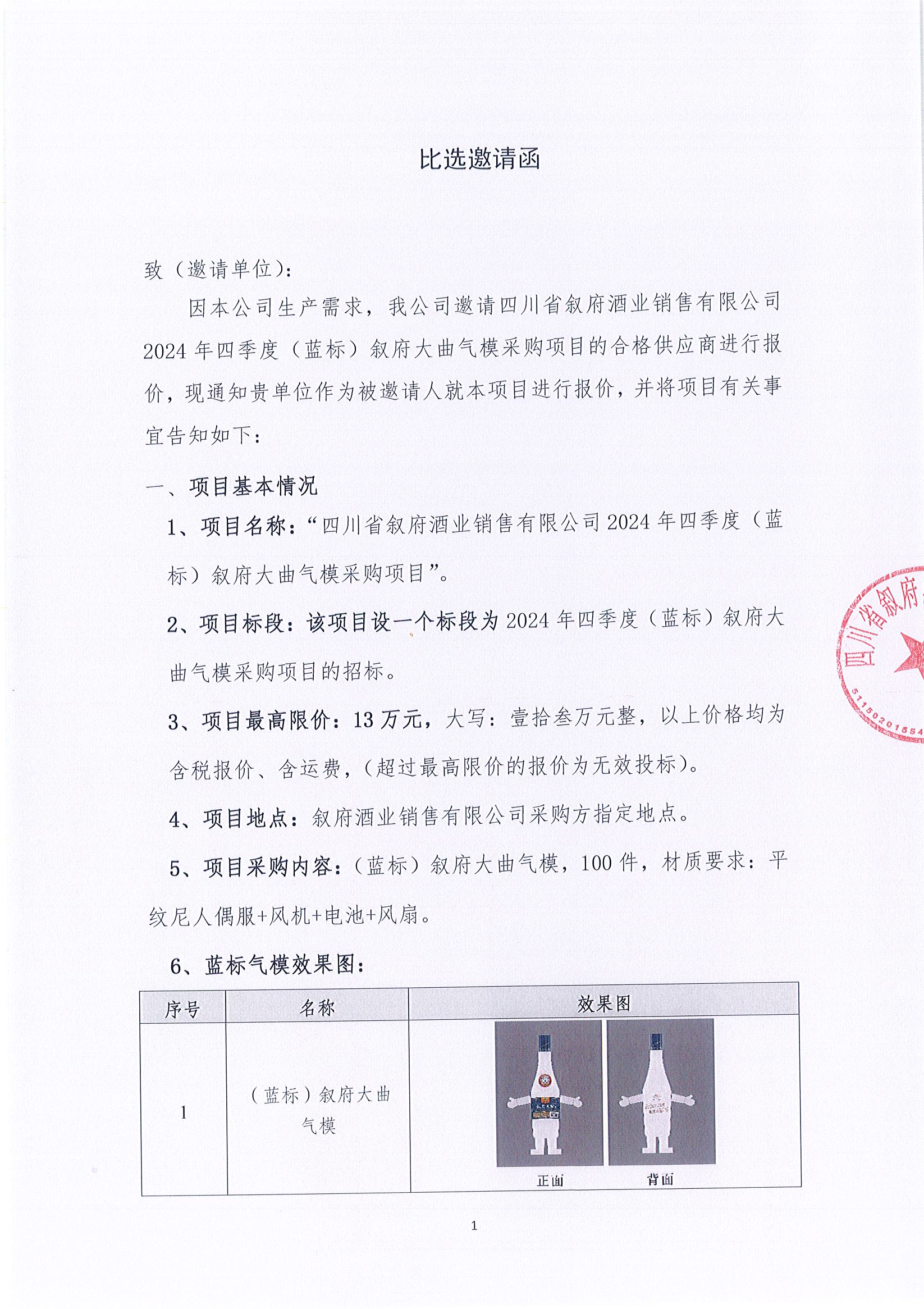 四川省敘府酒業(yè)銷售有限公司2024年四季度(藍(lán)標(biāo))敘府大曲氣模采購(gòu)項(xiàng)目比選公告