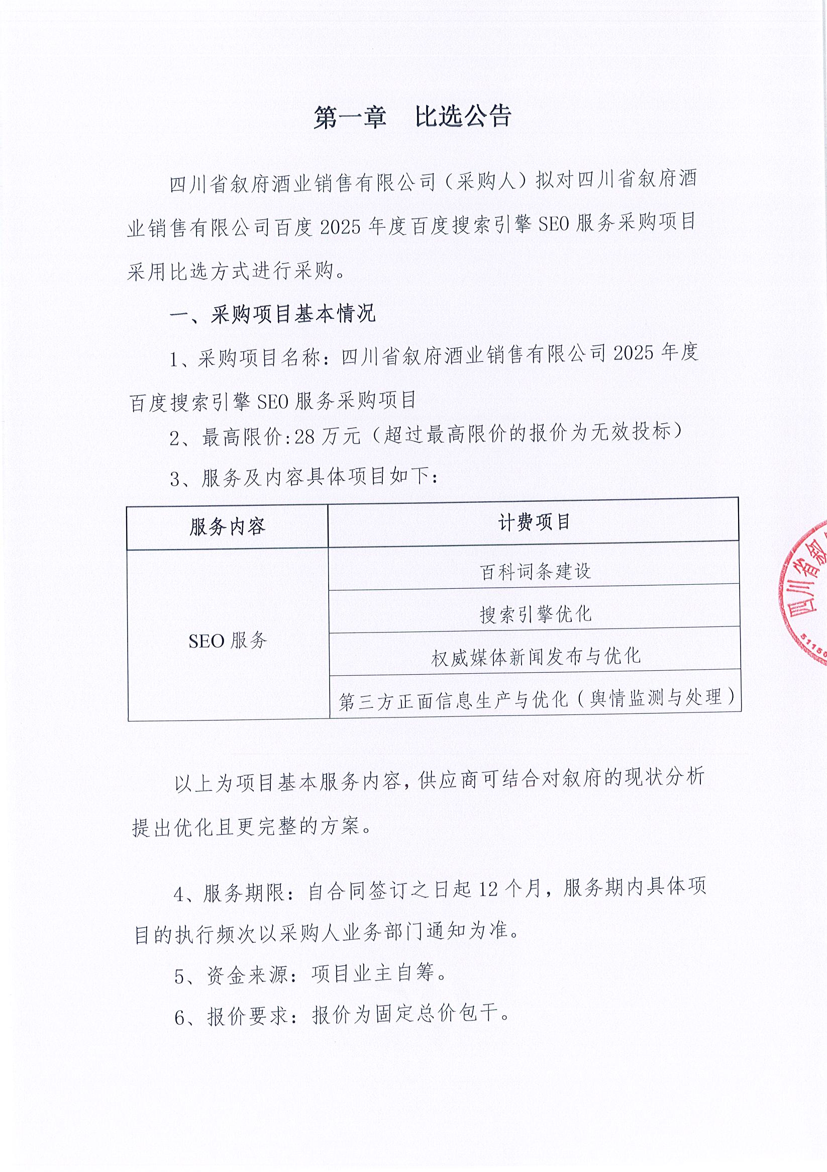 四川省敘府酒業(yè)銷售有限公司百度2025年度百度搜索引擎SEO服務(wù)采購(gòu)項(xiàng)目比選公示公告