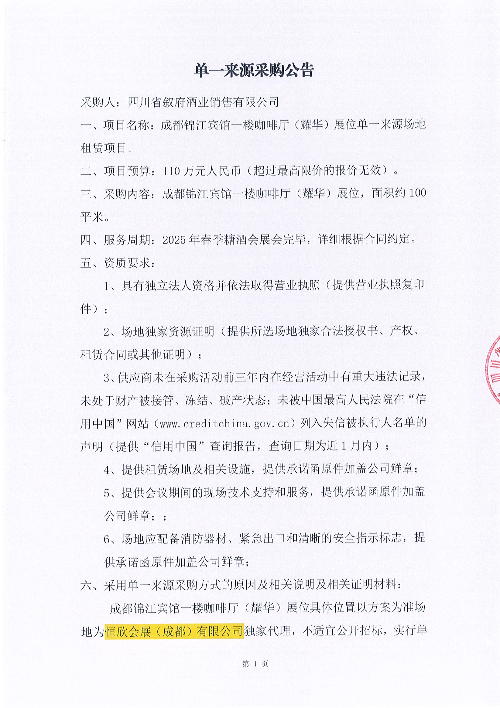 四川省宜賓市敘府酒業(yè)股份有限公司李莊遷建二期升級(jí)改造工程申報(bào)超長(zhǎng)期國(guó)債專項(xiàng)資金咨詢服務(wù)采購(gòu)項(xiàng)目競(jìng)爭(zhēng)性談判結(jié)果公示公告四川省敘府酒業(yè)銷售有限公司,對(duì)成都錦江賓館一樓咖啡廳(耀華)展位單一來(lái)源場(chǎng)地租賃項(xiàng)目結(jié)果公示公告