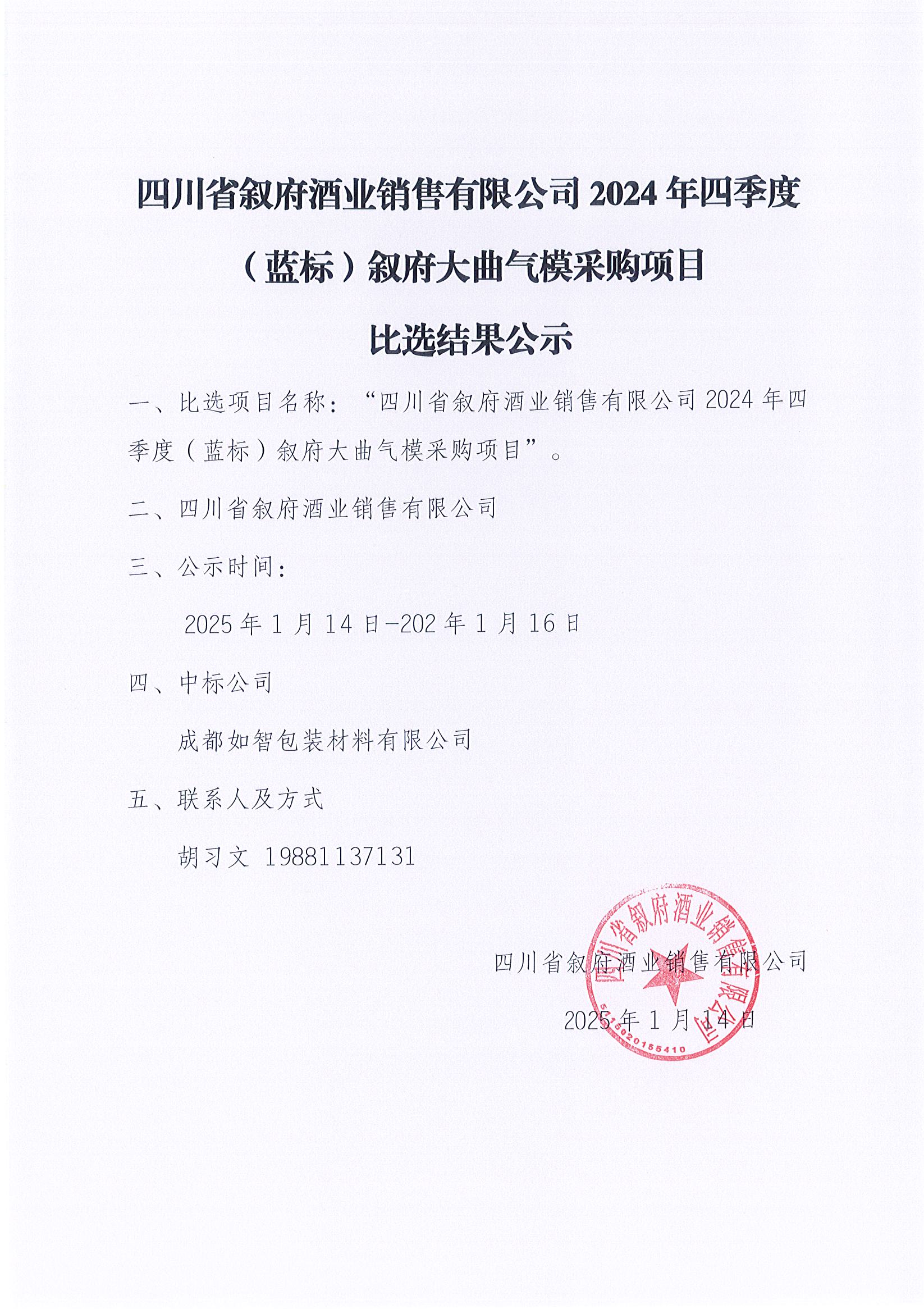 四川省敘府酒業(yè)銷售有限公司2024年四季度(藍(lán)標(biāo))敘府大曲氣模采購(gòu)項(xiàng)目比選結(jié)果公示公告