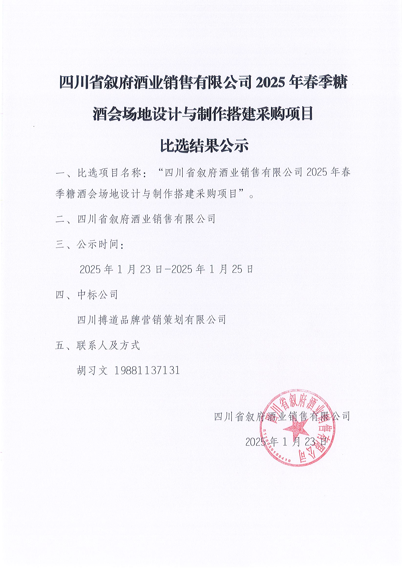 四川省敘府酒業(yè)銷售有限公司2025年春季糖酒會(huì)場(chǎng)地設(shè)計(jì)與制作搭建采購(gòu)項(xiàng)目比選結(jié)果公示公告