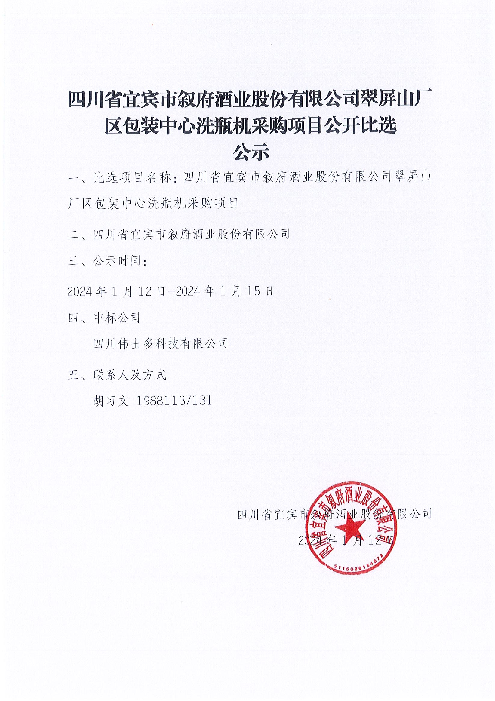 四川省宜賓市敘府酒業(yè)股份有限公司 2024年春季糖酒會(huì)(成都泰合國(guó)際大飯店)場(chǎng)地租賃中標(biāo)結(jié)果公示公告