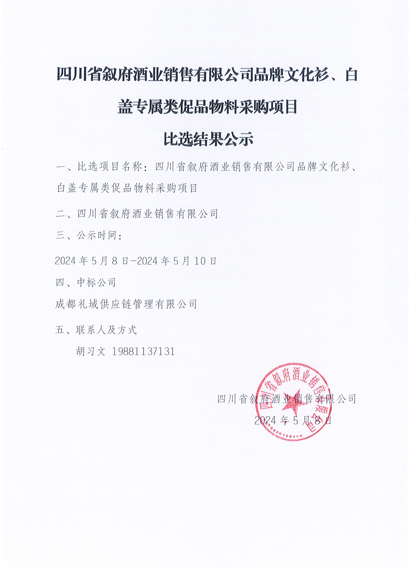 四川省敘府酒業(yè)銷售有限公司品牌文化衫、白蓋專屬類促品物料采購項目比選公告