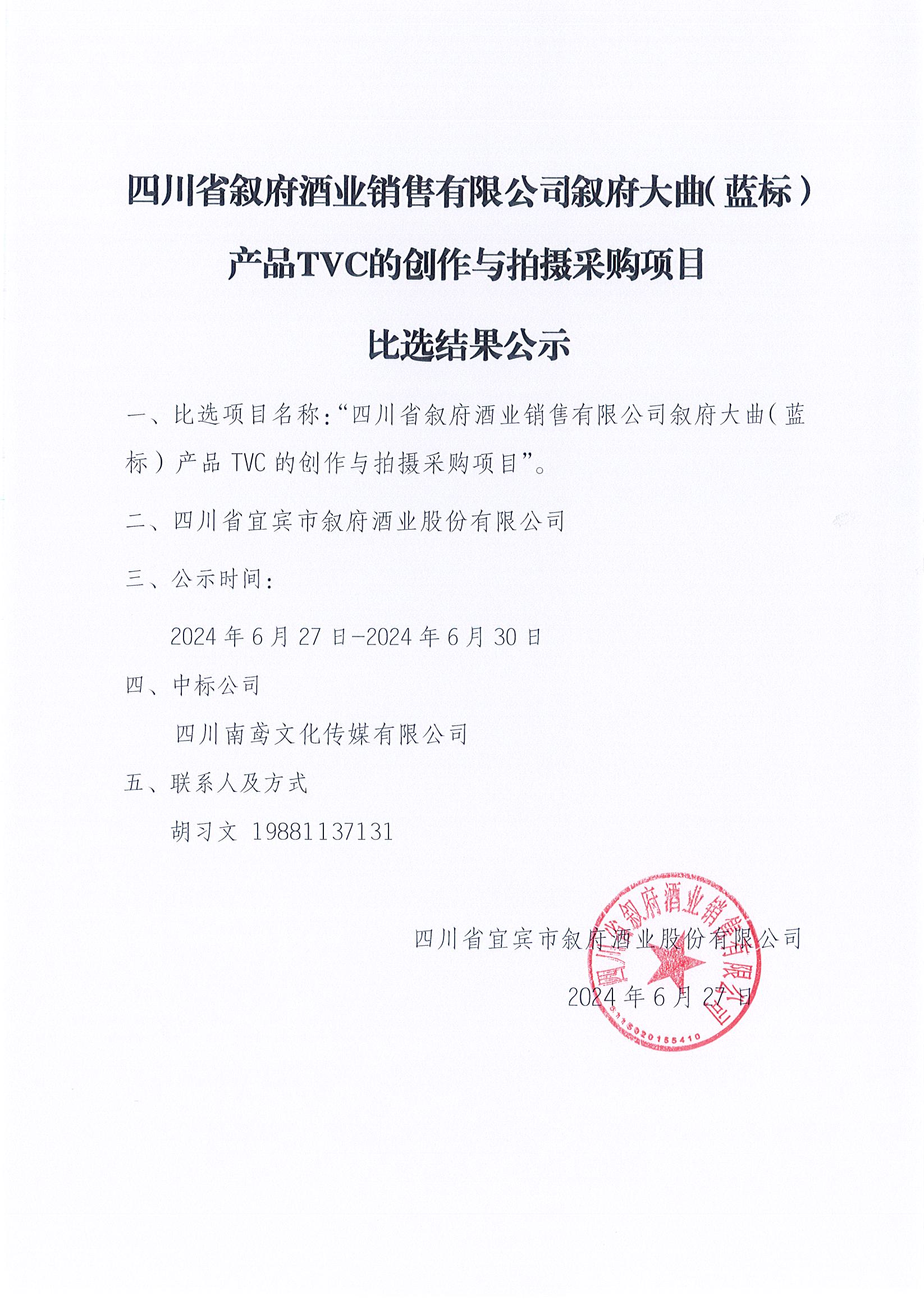 四川省敘府酒業(yè)銷(xiāo)售有限公司敘府大曲(藍(lán)標(biāo))產(chǎn)品TVC的創(chuàng)作與拍攝采購(gòu)項(xiàng)目中標(biāo)結(jié)果公示公告