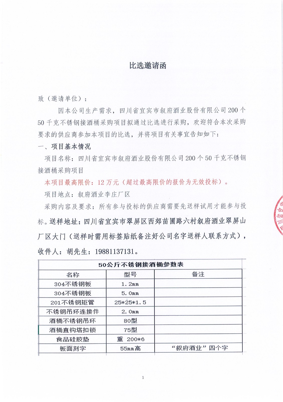 四川省宜賓市敘府酒業(yè)股份有限公司200個(gè)50千克不銹鋼接酒桶采購(gòu)項(xiàng)目流標(biāo)公示公告