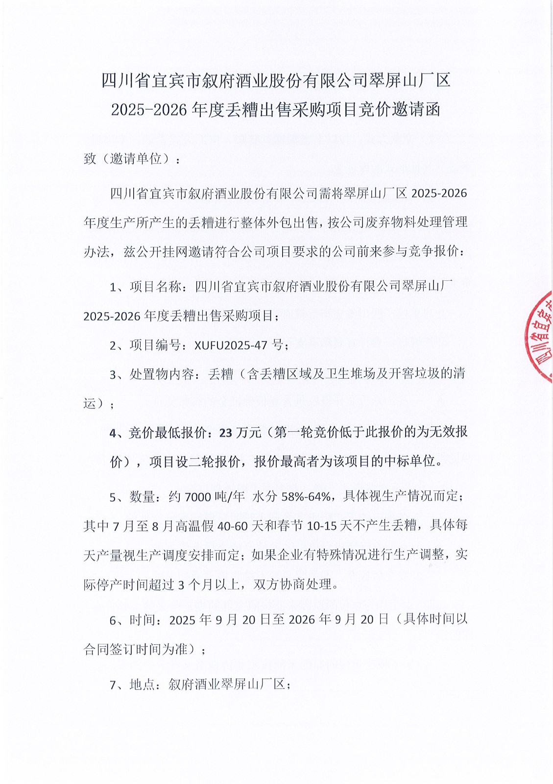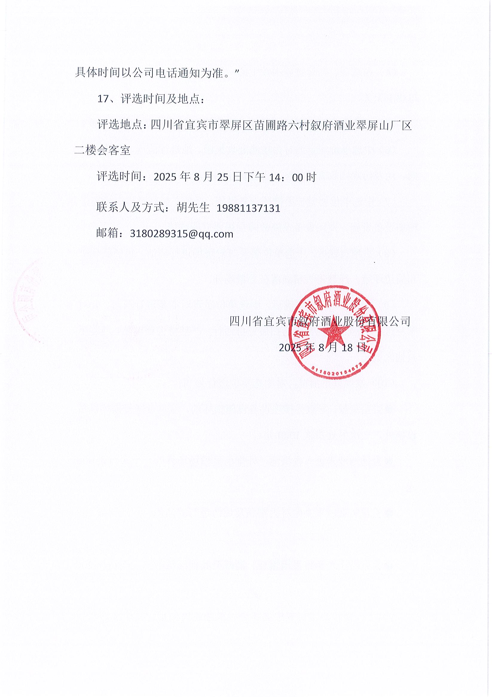 四川省宜賓市敘府酒業(yè)股份有限公司草簾采購項(xiàng)目比選公示公告